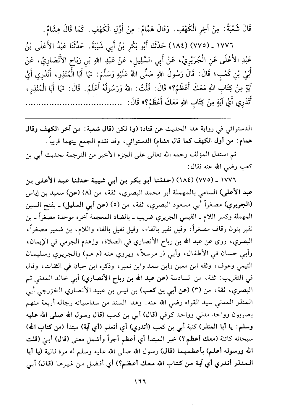 ١٧٧٦ - (٧٧٥) (١٨٤) (حدثنا أبو بكر بن أبي شيبة حدثنا عبد الأعلى بن عبد الأعلى) السامي بالمهملة أبو محمد البصري، ثقة، من (٨) (عن) سعيد بن إياس (الجريري) مصغرًا أبي مسعود البصري، ثقة، من (٥) (عن أبي السليل) -بفتح السين المهملة وكسر اللام- القيسي الجريري ضريب -بالضاد المعجمة آخره موحدة مصغرًا- بن نقير بنون وقاف مصغرًا، وقيل نفير بالفاء، وقيل نفيل بالفاء واللام، بن شمير مصغرًا، البصري، روى عن عبد الله بن رباح الأنصاري في الصلاة، وزهدم الجرمي في الإيمان، وأبي حسان في الأطفال، وأبي ذر مرسلًا، ويروي عنه (م عم) والجريري وسليمان التيمي وعوف، وثقه ابن معين وابن سعد وابن نمير، وذكره ابن حبان في الثقات، وقال في التقريب: ثقة، من السادسة (عن عبد الله بن رباح الأنصاري) أبي خالد المدني ثم البصري، ثقة، من (٣) (عن أبي بن كعب) بن قيس بن عبيد الأنصاري الخزرجي أبي المنذر المدني سيد القراء رضي الله عنه. وهذا السند من سداسياته رجاله أربعة منهم بصريون وواحد مدني وواحد كوفي (قال) أبي بن كعب (قال رسول الله صلى الله عليه وسلم: يا أبا المنذر) كنية أبي بن كعب (أتدري) أي أتعلم (أي آية) مبتدأ (من كتاب الله) سبحانه كائنة (معك أعظم؟ ) خبر المبتدأ أي أعظم أجرًا وأشمل معنى (قال) أبيّ (قلت الله ورسوله أعلم) بأعظمهما (قال) رسول الله صلى الله عليه وسلم له مرة ثانية (يا أبا المنذر أتدري أي آية من كتاب الله معك أعظم؟ ) أي أفضل من غيرها (قال) أبي