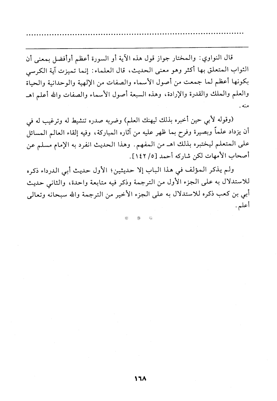 ولم يذكر المؤلف في هذا الباب إلا حديثين؛ الأول حديث أبي الدرداء ذكره للاستدلال به على الجزء الأول من الترجمة وذكر فيه متابعة واحدة، والثاني حديث أبي بن كعب ذكره للاستدلال به على الجزء الأخير من الترجمة والله سبحانه وتعالى أعلم.