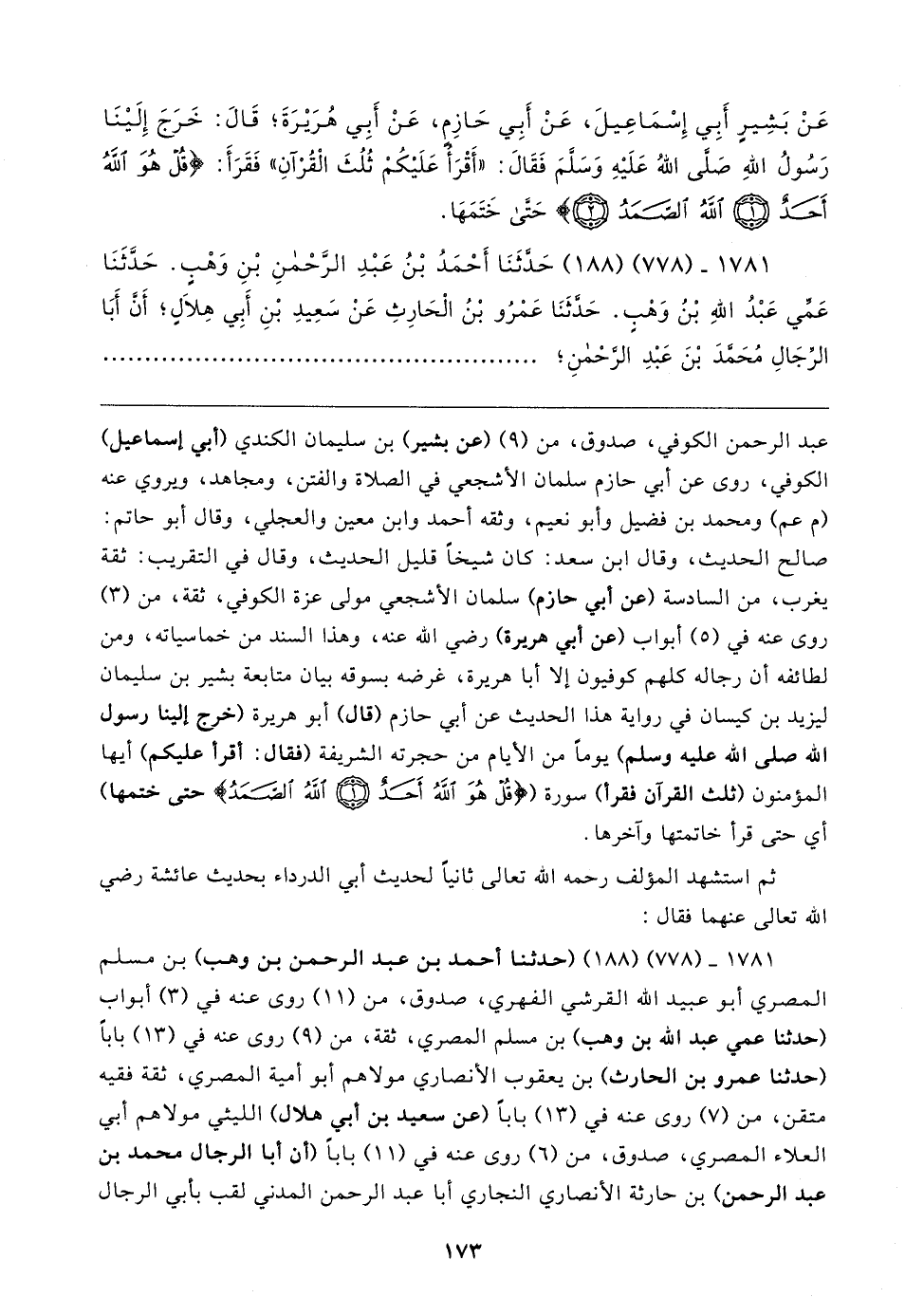 ١٧٨١ - (٧٧٨) (١٨٨) (حدثنا أحمد بن عبد الرحمن بن وهب) بن مسلم المصري أبو عبيد الله القرشي الفهري، صدوق، من (١١) روى عنه في (٣) أبواب (حدثنا عمي عبد الله بن وهب) بن مسلم المصري، ثقة، من (٩) روى عنه في (١٣) بابا (حدثنا عمرو بن الحارث) بن يعقوب الأنصاري مولاهم أبو أمية المصري، ثقة فقيه متقن، من (٧) روى عنه في (١٣) بابا (عن سعيد بن أبي هلال) الليثي مولاهم أبي العلاء المصري، صدوق، من (٦) روى عنه في (١١) بابا (أن أبا الرجال محمد بن عبد الرحمن) بن حارثة الأنصاري النجاري أبا عبد الرحمن المدني لقب بأبي الرجال