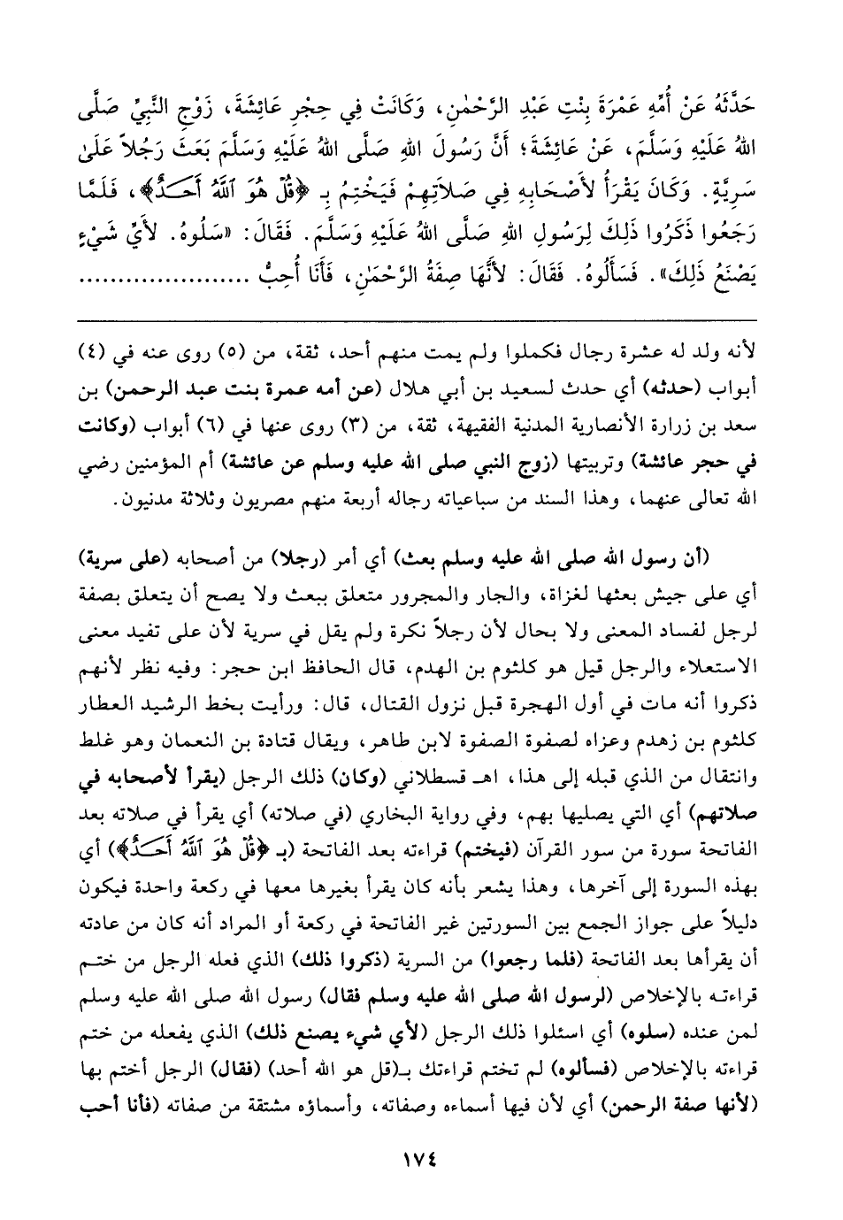 حَدَّثَهُ عَنْ أُمِّهِ عَمْرَةَ بِنْتِ عَبْدِ الرَّحْمنِ، وَكَانَتْ فِي حِجْرِ عَائِشَةَ، زَوْجِ النَّبِيِّ صَلَّى اللهُ عَلَيهِ وَسَلَّمَ، عَنْ عَائِشَةَ؛ أَنَّ رَسُولَ اللهِ صَلَّى اللهُ عَلَيهِ وَسَلَّمَ بَعَثَ رَجُلا عَلَى سَرِيَّةٍ. وَكَانَ يَقْرَأُ لأصحَابِهِ فِي صَلاتِهِمْ فَيَختِمُ بِـ {قُلْ هُوَ اللَّهُ أَحَدٌ}، فَلَمَّا رَجَعُوا ذَكَرُوا ذَلِكَ لِرَسُولِ اللهِ صَلَّى اللهُ عَلَيهِ وَسَلَّمَ. فَقَال: "سَلُوهُ. لأَيِّ شَيءٍ يَصْنَعُ ذَلِكَ". فَسَأَلُوهُ. فَقَال: لأَنَّهَا صِفَةُ الرَّحْمَنِ، فَأنَا أُحِبُّ