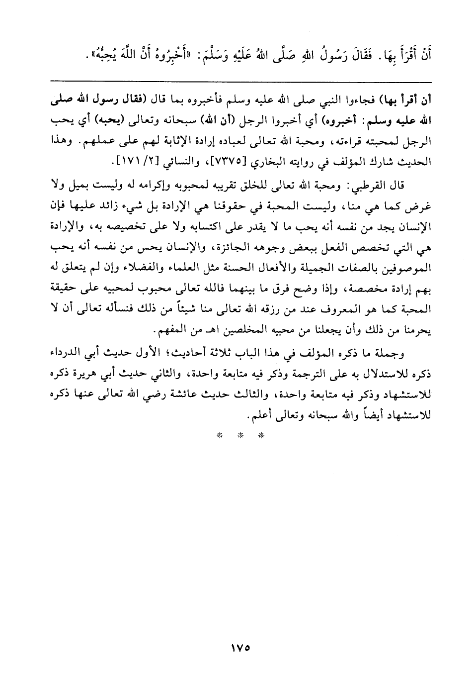 أَنْ أَقْرَأَ بِهَا. فَقَال رَسُولُ اللهِ صَلَّى اللهُ عَلَيهِ وَسَلَّمَ: "أَخْبِرُوهُ أَنَّ اللهَ يُحِبُّهُ"