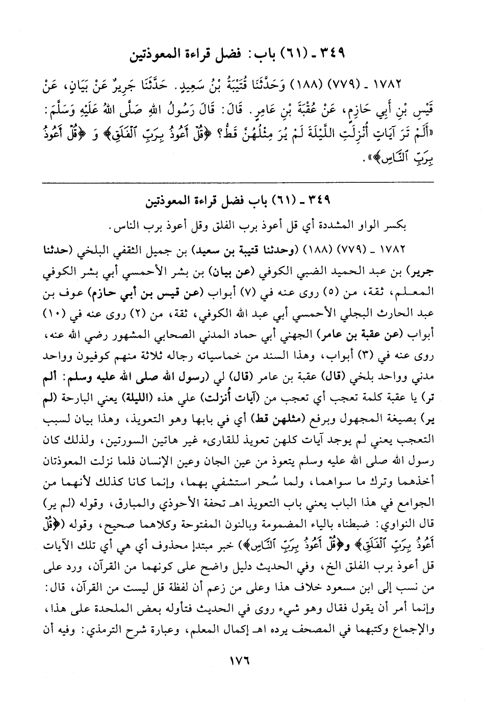 ١٧٨٢ - (٧٧٩) (١٨٨) (وحدثنا قتيبة بن سعيد) بن جميل الثقفي البلخي (حدثنا جرير) بن عبد الحميد الضبي الكوفي (عن بيان) بن بشر الأحمسي أبي بشر الكوفي المعلم، ثقة، من (٥) روى عنه في (٧) أبواب (عن قيس بن أبي حازم) عوف بن عبد الحارث البجلي الأحمسي أبي عبد الله الكوفي، ثقة، من (٢) روى عنه في (١٠) أبواب (عن عقبة بن عامر) الجهني أبي حماد المدني الصحابي المشهور رضي الله عنه، روى عنه في (٣) أبواب، وهذا السند من خماسياته رجاله ثلاثة منهم كوفيون وواحد مدني وواحد بلخي (قال) عقبة بن عامر (قال) لي (رسول الله صلى الله عليه وسلم: ألم تر) يا عقبة كلمة تحجب أي تعجب من (آيات أُنزلت) علي هذه (الليلة) يعني البارحة (لم ير) بصيغة المجهول وبرفع (مثلهن قط) أي في بابها وهو التعويذ، وهذا بيان لسبب التعجب يعني لم يوجد آيات كلهن تعويذ للقارئ غير هاتين السورتين، ولذلك كان رسول الله صلى الله عليه وسلم يتعوذ من عين الجان وعين الإنسان فلما نزلت المعوذتان أخذهما وترك ما سواهما، ولما سُحر استشفي بهما، وإنما كانا كذلك لأنهما من الجوامع في هذا الباب يعني باب التعويذ اهـ تحفة الأحوذي والمبارق، وقوله (لم ير) قال النواوي: ضبطناه بالياء المضمومة وبالنون المفتوحة وكلاهما صحيح، وقوله {قُلْ أَعُوذُ بِرَبِّ الْفَلَقِ} و {قُلْ أَعُوذُ بِرَبِّ النَّاسِ} خبر مبتدإ محذوف أي هي أي تلك الآيات قل أعوذ برب الفلق الخ، وفي الحديث دليل واضح على كونهما من القرآن، ورد على من نسب إلى ابن مسعود خلاف هذا وعلى من زعم أن لفظة قل ليست من القرآن، قال: وإنما أمر أن يقول فقال وهو شيء روى في الحديث فتأوله بعض الملحدة على هذا، والإجماع وكتبهما في المصحف يرده اهـ إكمال المعلم، وعبارة شرح الترمذي: وفيه أن