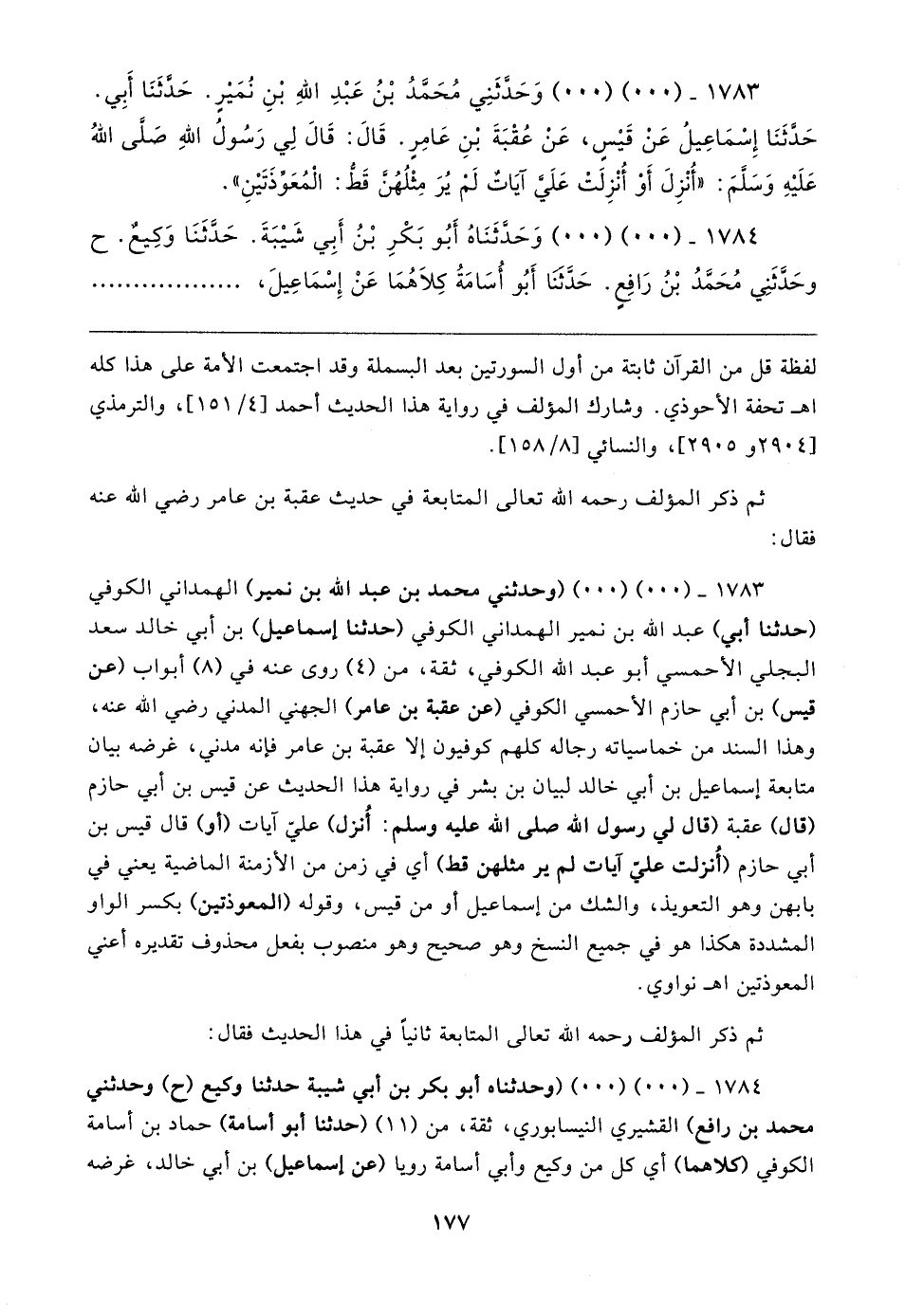 ١٧٨٣ - (٠٠) (٠٠) (وحدثني محمد بن عبد الله بن نمير) الهمداني الكوفي (حدثنا أبي) عبد الله بن نمير الهمداني الكوفي (حدثنا إسماعيل) بن أبي خالد سعد البجلي الأحمسي أبو عبد الله الكوفي، ثقة، من (٤) روى عنه في (٨) أبواب (عن قيس) بن أبي حازم الأحمسي الكوفي (عن عقبة بن عامر) الجهني المدني رضي الله عنه، وهذا السند من خماسياته رجاله كلهم كوفيون إلا عقبة بن عامر فإنه مدني، غرضه بيان متابعة إسماعيل بن أبي خالد لبيان بن بشر في رواية هذا الحديث عن قيس بن أبي حازم (قال) عقبة (قال لي رسول الله صلى الله عليه وسلم: أنزل) علي آيات (أو) قال قيس بن أبي حازم (أنزلت على آيات لم ير مثلهن قط) أي في زمن من الأزمنة الماضية يعني في بابهن وهو التعويذ، والشك من إسماعيل أو من قيس، وقوله (المعوذتين) بكسر الواو المشددة هكذا هو في جميع النسخ وهو صحيح وهو منصوب بفعل محذوف تقديره أعني المعوذتين اهـ نواوي.