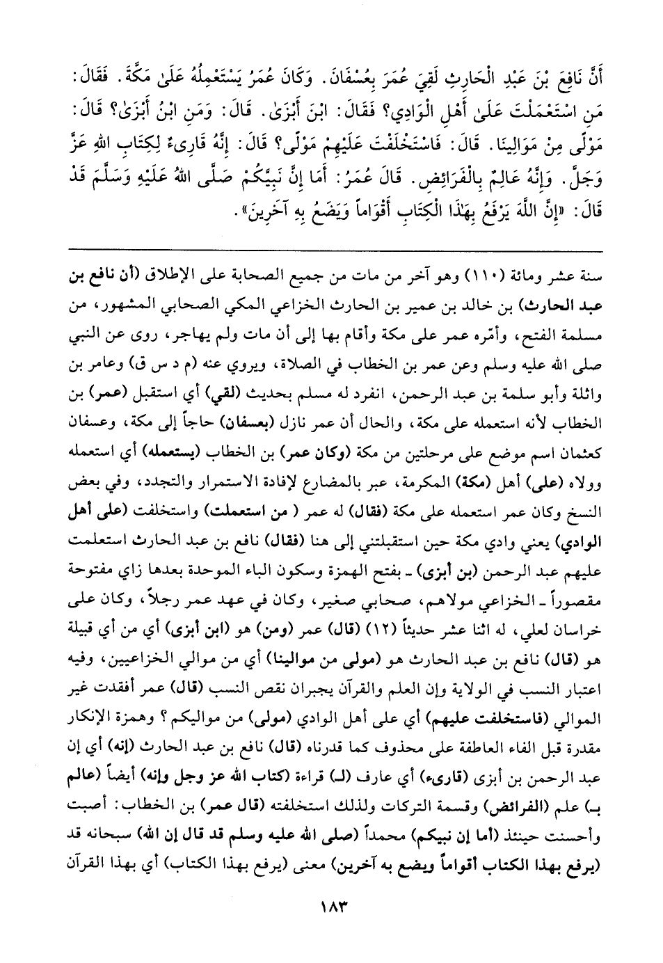 أنَّ نَافِعَ بْنَ عَبْدِ الْحَارِثِ لَقِيَ عُمَرَ بِعُسْفَانَ. وَكَانَ عُمَرُ يَسْتَعْمِلُهُ عَلَى مَكَّةَ. فَقَال: مَنِ اسْتَعْمَلْتَ عَلَى أَهْلِ الْوَادِي؟ فَقَال: ابْنَ أَبْزَى. قَال: وَمَنِ ابْنُ أَبْزَى؟ قَال: مَوْلًى مِنْ مَوَالِينَا. قَال: فَاسْتَخْلَفْتَ عَلَيهِمْ مَوْلًى؟ قَال: إِنَّهُ قَارِئٌ لِكِتَابِ اللهِ عَزَّ وَجَلَّ. وَإِنهُ عَالِمٌ بِالْفَرَائِضِ. قَال عُمَرُ: أَمَا إِن نَبِيَّكُمْ صَلَّى اللهُ عَلَيهِ وَسَلَّمَ قَدْ قَال: "إِنَّ اللهَ يَرْفَعُ بِهَذَا الْكِتَابِ أَقْوَامًا ويضَعُ بِهِ آخَرِينَ"