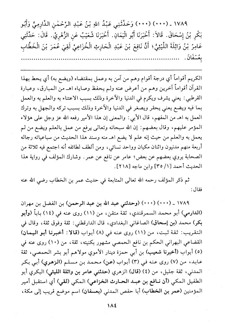 ١٧٨٩ - (٠٠) (٠٠) (وحدثني عبد الله بن عبد الرحمن) بن الفضل بن مهران (الدارمي) أبو محمد السمرقندي، ثقة متقن، من (١١) روى عنه في (١٤) بابا (وأبو بكر) محمد (بن إسحاق) الصاغاني البغدادي، قال الدارقطني: ثقة وفوق ثقة، وقال في التقريب: ثقة ثبت، من (١١) روى عنه في (٨) أبواب (قالا: أخبرنا أبو اليمان) القضاعي البهراني الحكم بن نافع الحمصي مشهور بكنيته، ثقة، من (١٠) روى عنه في (٥) أبواب (أخبرنا شعيب) بن أبي حمزة دينار الأموي مولاهم أبو بشر الحمصي، ثقة عابد، من (٧) روى عنه في (٣) أبواب (عن) محمد بن مسلم (الزهري) أبي بكر المدني، ثقة جليل، من (٤) (قال) الزهري (حدثني عامر بن واثلة الليثي) البكري أبو الطفيل المكي (أن نافع بن عبد الحارث الخزاعي) المكي (لقي) أي استقبل أمير المؤمنين (عمر بن الخطاب) أبا حفص المدني (بعسفان) اسم موضع قريب إلى مكة،