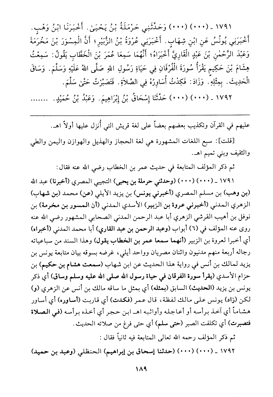 ١٧٩١ - (٠٠) (٠٠) وَحَدَّثَنِي حَرْمَلَةُ بْنُ يَحْيَى. أَخْبَرَنَا ابْنُ وَهْبٍ. أَخْبَرَنِي يُونُسُ عَنِ ابْنِ شِهَاب. أَخْبَرَنِي عُرْوَةُ بْنُ الزبَيرِ؛ أَنَّ الْمِسْوَرَ بْنَ مَخْرَمَةَ وَعَبْدَ الرَّحْمنِ بْنَ عَبْدٍ الْقَارِيَّ أَخْبَرَاهُ؛ أَنَّهُمَا سَمِعَا عُمَرَ بْنَ الْخَطَّابِ يَقُولُ: سَمِعْتُ هِشَامَ بْنَ حَكِيمٍ يَقْرَأُ سُورَةَ الْفُرْقَانِ فِي حَيَاةِ رَسُولِ اللهِ صَلّى اللهُ عَلَيهِ وَسَلمَ. وَسَاقَ الْحَدِيثَ. بِمِثْلِهِ. وَزَادَ: فَكِدْتُ أُسَاورُهُ فِي الصلاةِ. فَتَصَبَّرْتُ حَتَّى سَلَّمَ.