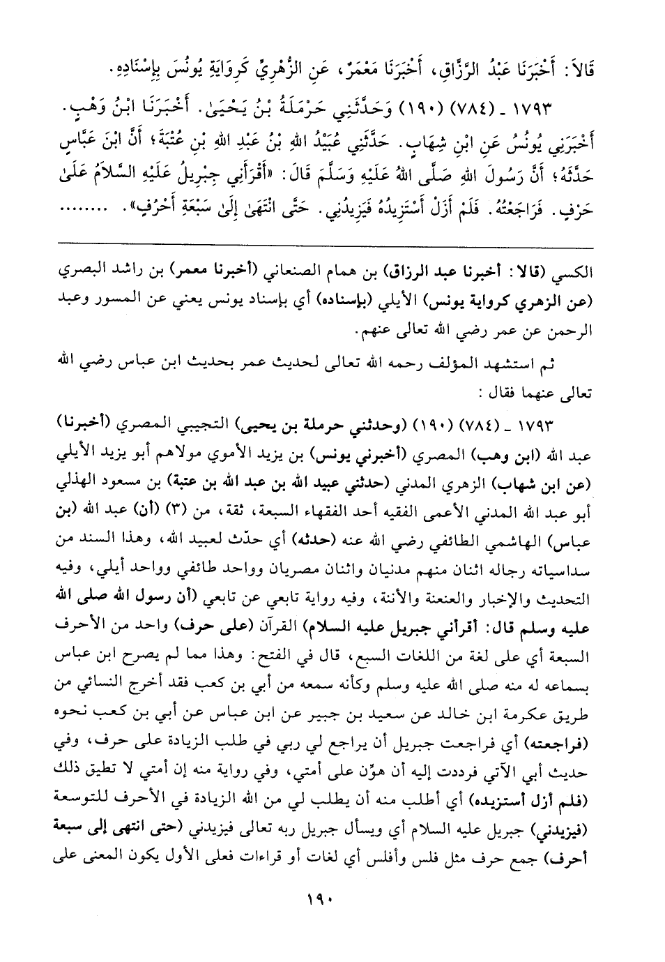 ١٧٩٣ - (٧٨٤) (١٩٠) وَحَدَّثَنِي حَرْمَلَةُ بْنُ يَحْيَى. أَخْبَرَنَا ابْنُ وَهْبٍ. أَخْبَرَنِي يُونُسُ عَنِ ابْنِ شِهَابٍ. حَدَّثَنِي عُبَيدُ اللهِ بْنُ عَبْدِ اللهِ بْنِ عُتْبَةَ؛ أَن ابْنَ عَبَّاسٍ حَدَّثَهُ؛ أَن رَسُولَ اللهِ صَلى اللهُ عَلَيهِ وَسَلمَ قَال: "أَقْرَأَنِي جِبْرِيلُ عَلَيهِ السَّلامُ عَلَى حَرْفٍ. فَرَاجَعْتُهُ. فَلَمْ أَزَلْ أَسْتَزِيدُهُ فَيَزِيدُنِي. حَتى انْتَهَى إِلَى سَبْعَةِ أَحْرُفٍ"