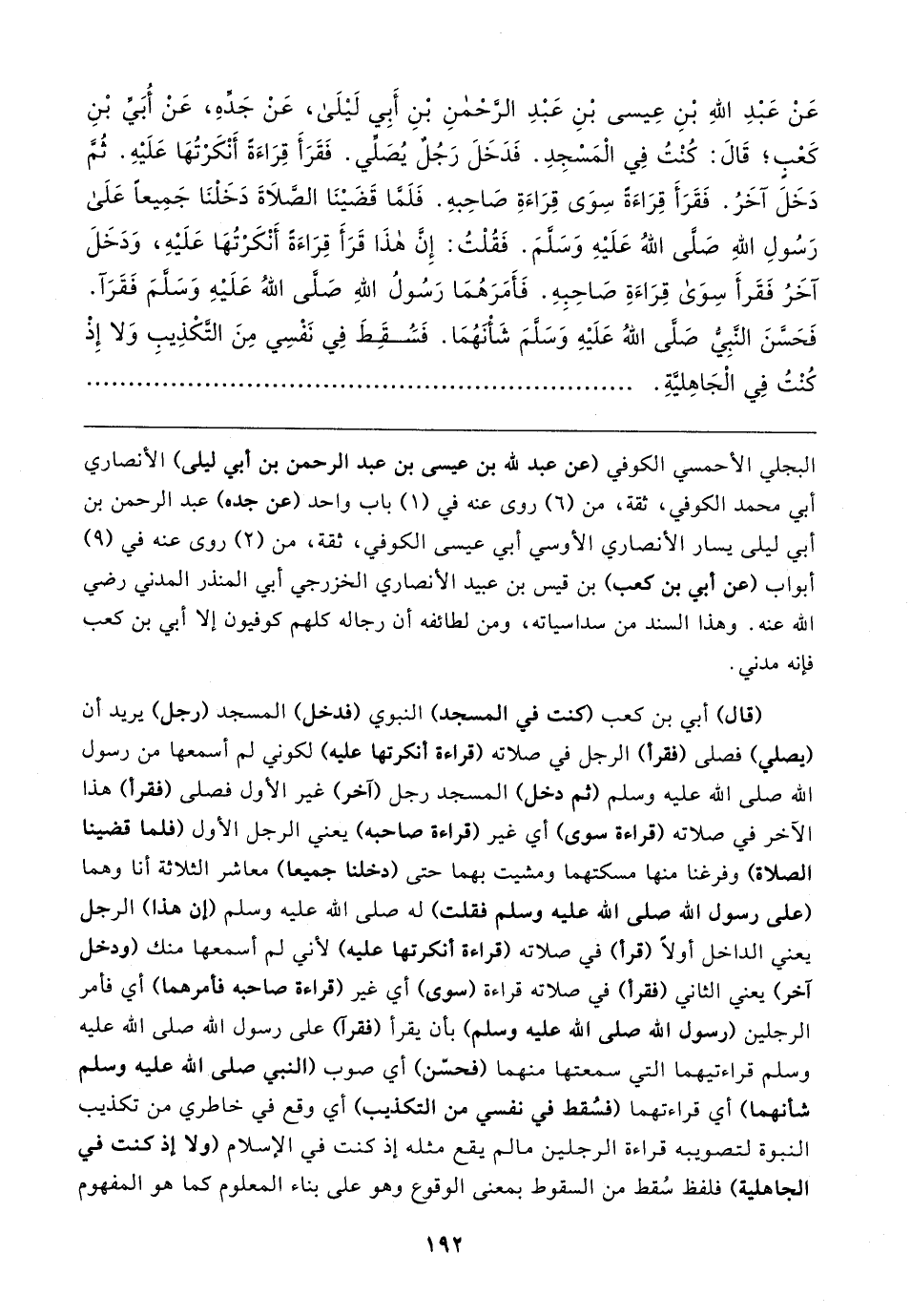 عَنْ عَبْدِ اللهِ بْنِ عِيسى بْنِ عَبْدِ الرَّحْمنِ بْنِ أَبِي لَيلَى، عَنْ جَدِّهِ، عَنْ أُبَي بْنِ كَعْبٍ؛ قَال: كُنْتُ فِي الْمَسْجِدِ. فَدَخَلَ رَجُل يُصَلِّي. فَقَرَأَ قِرَاءَة أَنْكَرْتُهَا عَلَيهِ. ثُمَّ دَخَلَ آخَرُ. فَقَرَأَ قِرَاءَةَ سِوَى قِرَاءَةِ صَاحِبهِ. فَلَمَّا قَضَينَا الصَّلاةَ دَخَلْنَا جَمِيعًا عَلَي رَسُولِ اللهِ صَلَّى اللهُ عَلَيهِ وَسَلَّمَ. فَقُلْتُ: إِن هذَا قَرَأَ قِرَاءَةً أَنْكَرْتُهَا عَلَيهِ، وَدَخَلَ آخَرُ فَقَرأَ سِوَى قِرَاءَةِ صَاحِبِهِ. فَأَمَرَهُمَا رَسُولُ اللهِ صَلى اللهُ عَلَيهِ وَسَلمَ فَقَرَآ. فَحَسَّنَ النبِي صَلَّى اللهُ عَلَيهِ وَسَلَّمَ شَأْنَهُمَا. فَسُقِطَ فِي نَفْسِي مِنَ التَّكْذِيبِ وَلا إِذْ كنْتُ فِي الْجَاهِليَّةِ