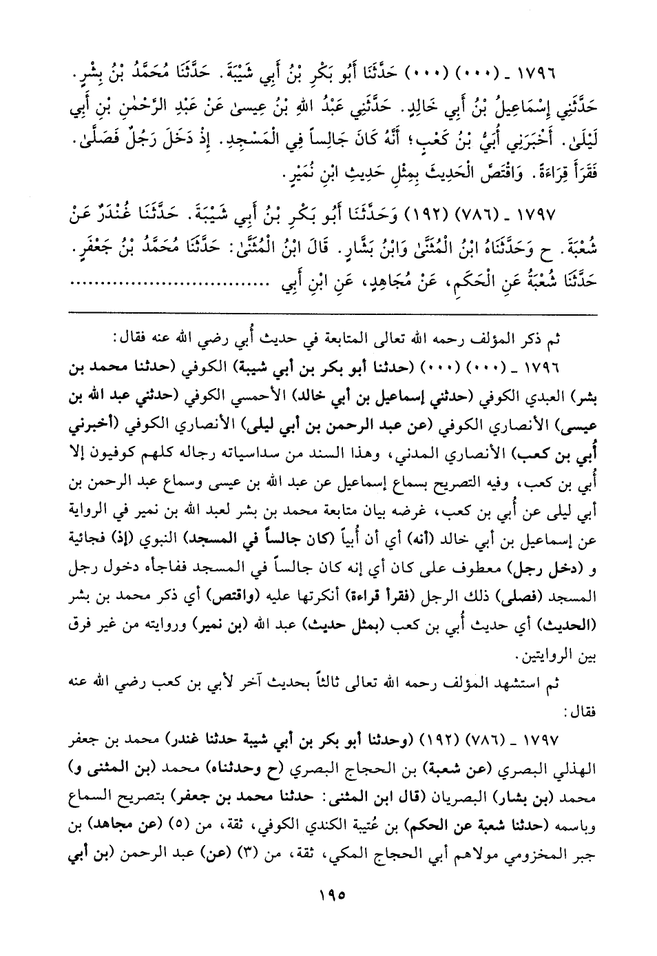 ١٧٩٦ - (٠٠) (٠٠) (حدثنا أبو بكر بن أبي شيبة) الكوفي (حدثنا محمد بن بشر) العبدي الكوفي (حدثني إسماعيل بن أبي خالد) الأحمسي الكوفي (حدثني عبد الله بن عيسى) الأنصاري الكوفي (عن عبد الرحمن بن أبي ليلى) الأنصاري الكوفي (أخبرني أُبي بن كعب) الأنصاري المدني، وهذا السند من سداسياته رجاله كلهم كوفيون إلا أُبي بن كعب، وفيه التصريح بسماع إسماعيل عن عبد الله بن عيسى وسماع عبد الرحمن بن أبي ليلى عن أُبي بن كعب، غرضه بيان متابعة محمد بن بشر لعبد الله بن نمير في الرواية عن إسماعيل بن أبي خالد (أنه) أي أن أُبيًا (كان جالسًا في المسجد) النبوي (إذ) فجائية و (دخل رجل) معطوف على كان أي إنه كان جالسًا في المسجد ففاجأه دخول رجل المسجد (فصلى) ذلك الرجل (فقرأ قراءة) أنكرتها عليه (واقتص) أي ذكر محمد بن بشر (الحديث) أي حديث أُبي بن كعب (بمثل حديث) عبد الله (بن نمير) وروايته من غير فرق بين الروايتين.