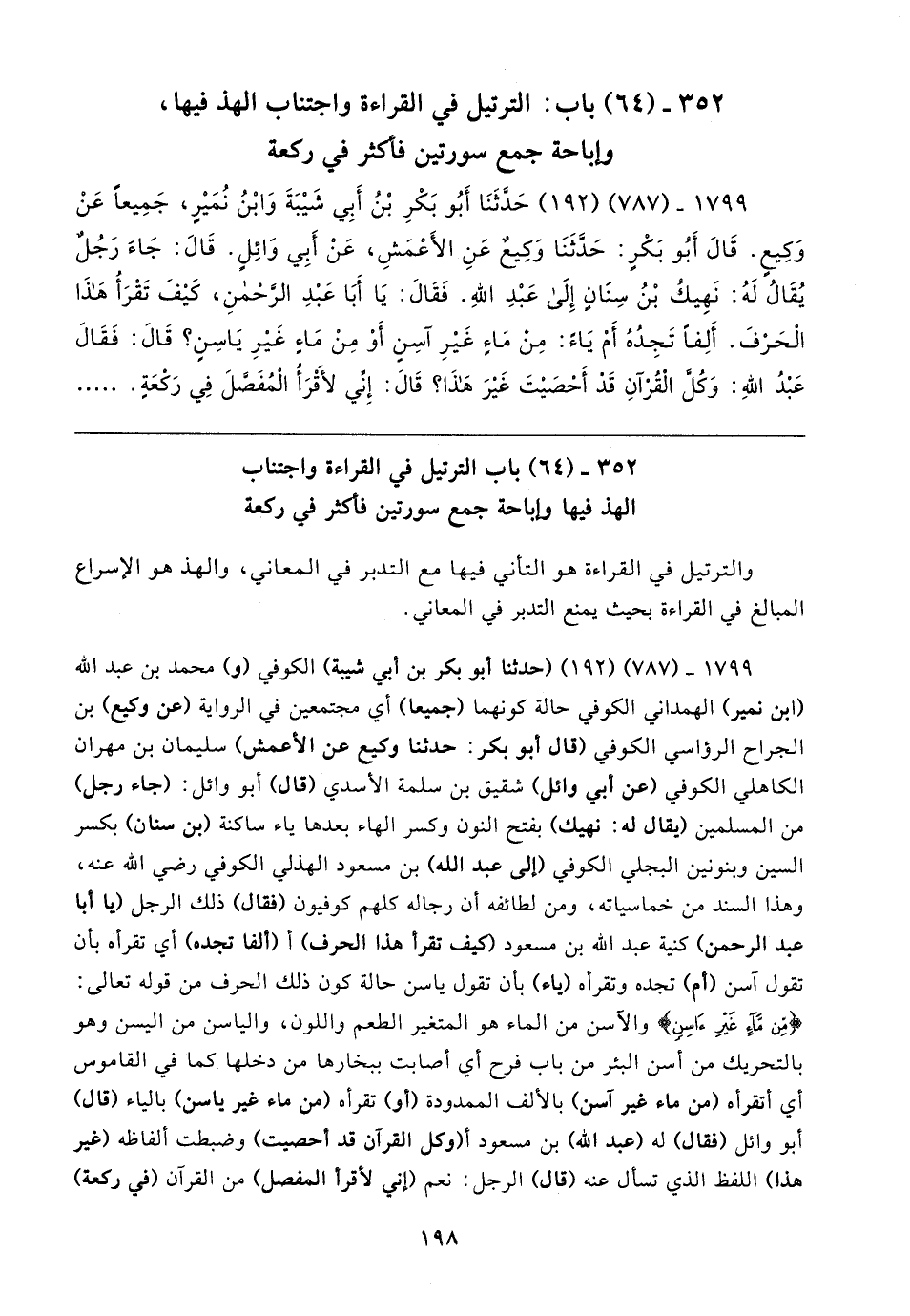 ١٧٩٩ - (٧٨٧) (١٩٢) حَدَّثَنَا أَبُو بَكْرِ بْنُ أَبِي شَيبَةَ وَابْنُ نُمَيرٍ، جَمِيعًا عَنْ وَكِيعٍ. قَال أَبُو بَكْرٍ: حَدَّثَنَا وَكِيعٌ عَنِ الأَعْمَشِ، عَنْ أَبِي وَائِلٍ. قَال: جَاءَ رَجُلٌ يُقَالُ لَهُ: نَهِيكُ بْنُ سِنَانٍ إِلَى عَبْدِ اللهِ. فَقَال: يَا أَبَا عَبْدِ الرَّحْمنِ، كَيفَ تَقْرَأُ هَذَا الْحَرْفَ. أَلِفًا تَجِدُهُ أَمْ يَاءً: مِنْ مَاءِ غَيرِ آسِنٍ أَوْ مِنْ مَاء غَيرِ يَاسِنٍ؟ قَال: فَقَال عَبْدُ اللهِ: وَكُل الْقُرْآنِ قَد أَحْصَيتَ غَيرَ هَذَا؟ قَال: إِنِّي لأقرَأُ الْمُفَصَّلَ فِي رَكْعَةٍ