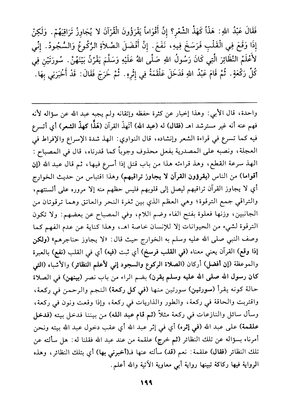 فَقَال عَبْدُ اللهِ: هَذا كَهَذِّ الشِّعْرِ؟ إِنَّ أَقْوَامًا يَقْرَؤُونَ الْقُرْآنَ لا يُجَاوزُ تَرَاقِيَهُمْ. وَلَكِنْ إِذَا وَقَعَ فِي الْقَلْبِ فَرَسَخَ فِيهِ، نَفَعَ. إِن أَفْضَلَ الصلاةِ الرُّكُوعُ وَالسُّجُودُ. إِنِّي لأعلَمُ النَّظَائِرَ التِي كَانَ رَسُولُ اللهِ صَلَّى اللهُ عَلَيهِ وَسَلَّمَ يَقْرُنُ بَينَهُنَّ. سُورَتَينِ فِي كُلِّ رَكْعَةٍ. ثُم قَامَ عَبْدُ اللهِ فَدَخَلَ عَلْقَمَةُ فِي إِثْرِهِ. ثُم خَرَجَ فَقَال: قَدْ أَخْبَرَنِي بِهَا