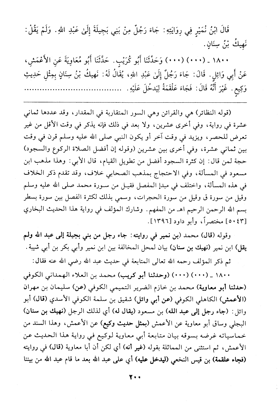 ١٨٠٠ - (٠٠) (٠٠) (وحدثنا أبو كريب) محمد بن العلاء الهمداني الكوفي (حدثنا أبو معاوية) محمد بن خازم الضرير التميمي الكوفي (عن) سليمان بن مهران (الأعمش) الكاهلي الكوفي (عن أبي وائل) شقيق بن سلمة الكوفي الأسدي (قال) أبو وائل: (جاء رجل إلى عبد الله) بن مسعود (يقال له) أي لذلك الرجل (نهيك بن سنان) البجلي وساق أبو معاوية عن الأعمش (بمثل حديث وكيع) عن الأعمش، وهذا السند من خماسياته غرضه بسوقه بيان متابعة أبي معاوية لوكيع في رواية هذا الحديث عن الأعمش، ثم استثنى من المماثلة بقوله (غير أنه) أي لكن أن أبا معاوية (قال) في روايته (فجاء علقمة) بن قيس النخعي (ليدخل عليه) أي على عبد الله بعد ما قام عبد الله من بيننا
