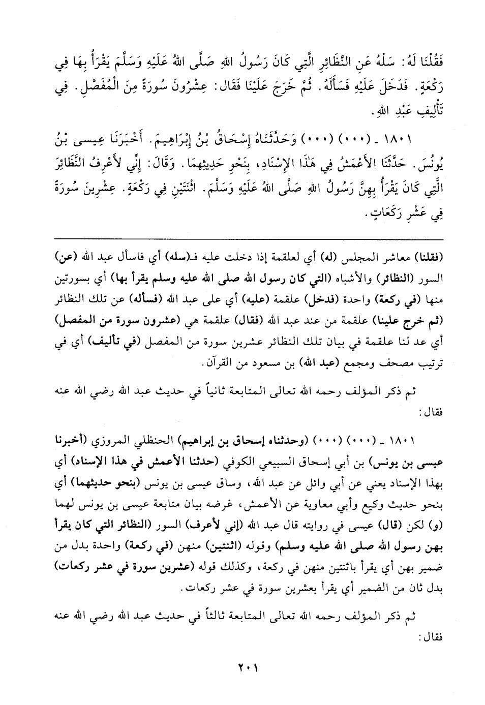 ١٨٠١ - (٠٠) (٠٠) وَحَدَّثَنَاهُ إِسْحَاقُ بْنُ إِبْرَاهِيمَ. أَخْبَرَنَا عِيسى بْنُ يُونُسَ. حَدَّثنَا الأَعْمَشُ فِي هَذَا الإِسْنَادِ، بِنَحْو حَدِيثِهمَا. وَقَال: إِنِّي لأَعْرِفُ النَّظَائِرَ الَّتِي كَانَ يَقْرَأُ بِهِنَّ رَسُولُ اللهِ صَلَّى اللهُ عَلَيهِ وَسَلَّمَ. اثْنَتَينِ فِي رَكْعَةِ. عِشْرِينَ سُورَةً فِي عَشْرِ رَكَعَاتٍ