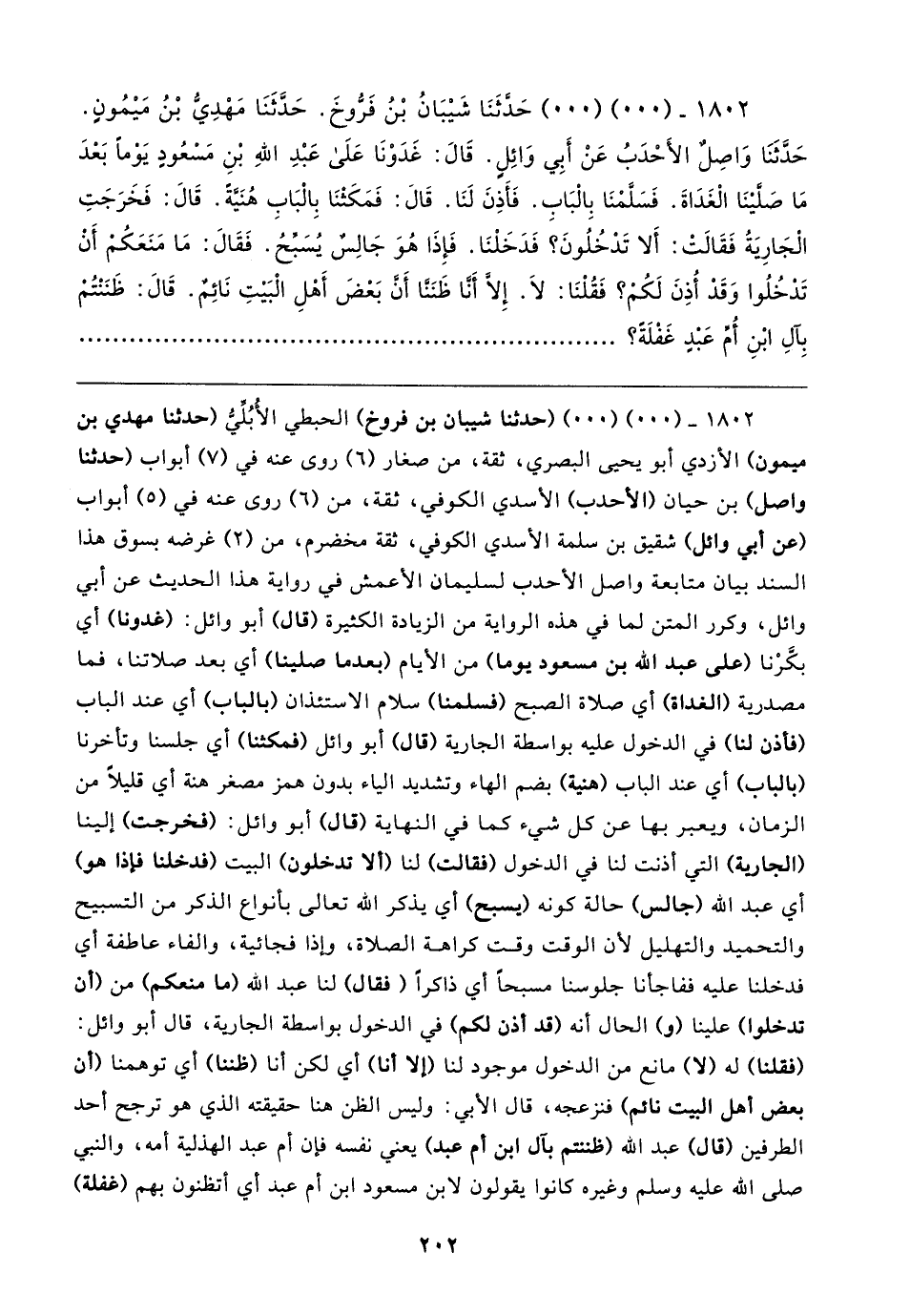 ١٨٠٢ - (٠٠) (٠٠) حَدَّثَنَا شَيبَانُ بْنُ فَرُّوخَ. حَدَّثَنَا مَهْدِيُّ بْنُ مَيمُونٍ. حَدَّثنَا وَاصِلٌ الأَحْدَبُ عَنْ أَبِي وَائِلٍ. قَال: غَدَوْنَا عَلَى عَبْدِ اللهِ بْنِ مَسْعُودٍ يَومًا بَعْدَ مَا صلَّينَا الْغَدَاةَ. فَسَلَّمْنَا بِالْبَابِ. فَأَذِنَ لَنَا. قَال: فَمَكَثْنَا بِالْبَابِ هُنَيَّة. قَال: فَخَرَجَتِ الْجَارِيَةُ فَقَالتْ: أَلا تَدْخُلُونَ؟ فَدَخَلْنَا. فَإِذَا هُوَ جَالِسٌ يُسَبِّحُ. فَقَال: مَا مَنَعَكُمْ أَن تَدخُلُوا وَقَدْ أُذِنَ لَكُمْ؟ فَقُلْنَا: لَا. إِلَّا أَنَّا ظَنَنَّا أَن بَعْضَ أَهْلِ الْبَيتِ نَائِمٌ. قَال: ظَنَنْتُمْ بِآلِ ابْنِ أُمِّ عَبْدٍ غَفْلَة؟