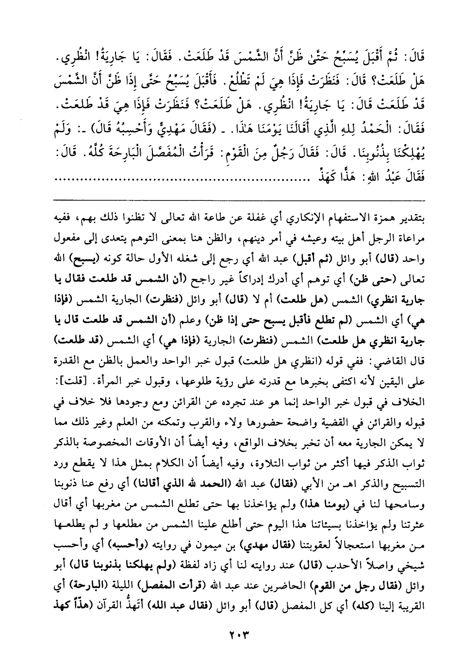 قَال: ثُمَّ أَقْبَلَ يُسَبِّحُ حَتَّى ظَنَّ أَنَّ الشَّمْسَ قَدْ طَلَعَتْ. فَقَال: يَا جَارِيَةُ! انْظُرِي. هَلْ طَلَعَتْ؟ قَال: فَنَظَرَتْ فَإِذَا هِيَ لَمْ تَطْلُعْ. فَأَقْبَلَ يُسَبِّحُ حَتَّى إِذَا ظَن أَنَّ الشَّمْسَ قَدْ طَلَعَتْ قَال: يَا جَارِيةُ! انْظُرِي. هَلْ طَلَعَتْ؟ فَنَظَرَتْ فَإذَا هِيَ قَدْ طَلعَتْ. فَقَال: الْحَمْدُ لِلهِ الَّذِي أَقَالنَا يَوْمَنَا هَذا. - (فَقَال مَهْدِيٍّ وَأَحْسِبُهُ قَال) -: وَلَمْ يُهْلِكْنَا بِذُنُوبِنَا. قَال: فَقَال رَجُلٌ مِنَ الْقَوْمِ: قَرَأْتُ الْمُفَضَّلَ الْبَارِحَةَ كُلَّهُ. قَال: فَقَال عَبْدُ اللهِ: هَذًّا كَهَذِّ