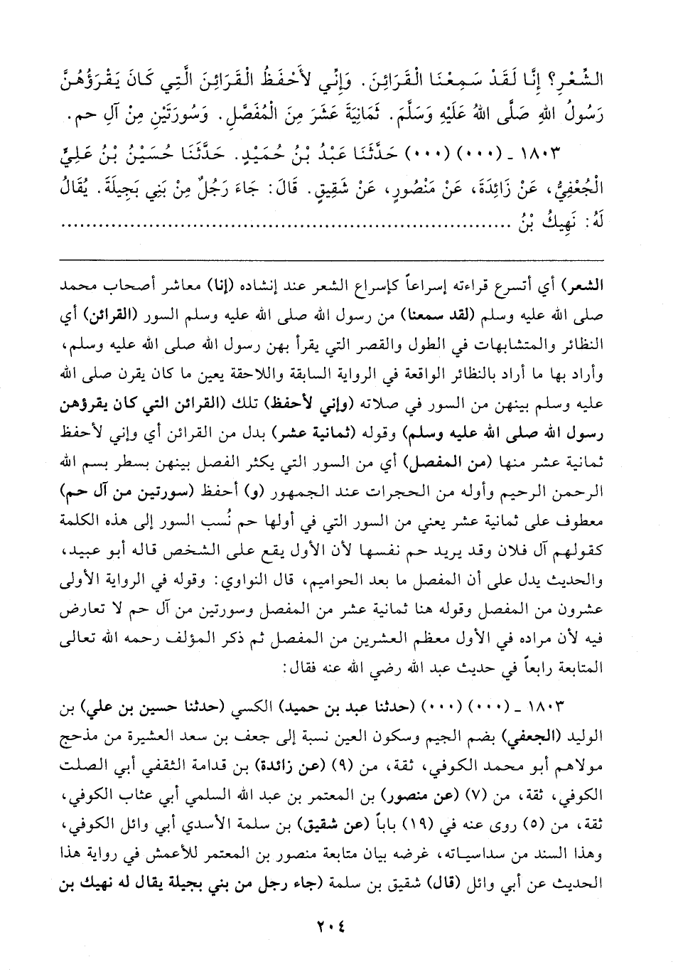 ١٨٠٣ - (٠٠) (٠٠) حَدَّثَنَا عَبْدُ بْنُ حُمَيدٍ. حَدَّثَنَا حُسَينُ بْنُ عَلِيٍّ الْجُعْفِي، عَنْ زَائِدَةَ، عَنْ مَنْصُورٍ، عَنْ شَقِيقٍ. قَال: جَاءَ رَجُلٌ مِنْ بَنِي بَجِيلَةَ. يُقَالُ لَهُ: نَهِيكُ بْنُ