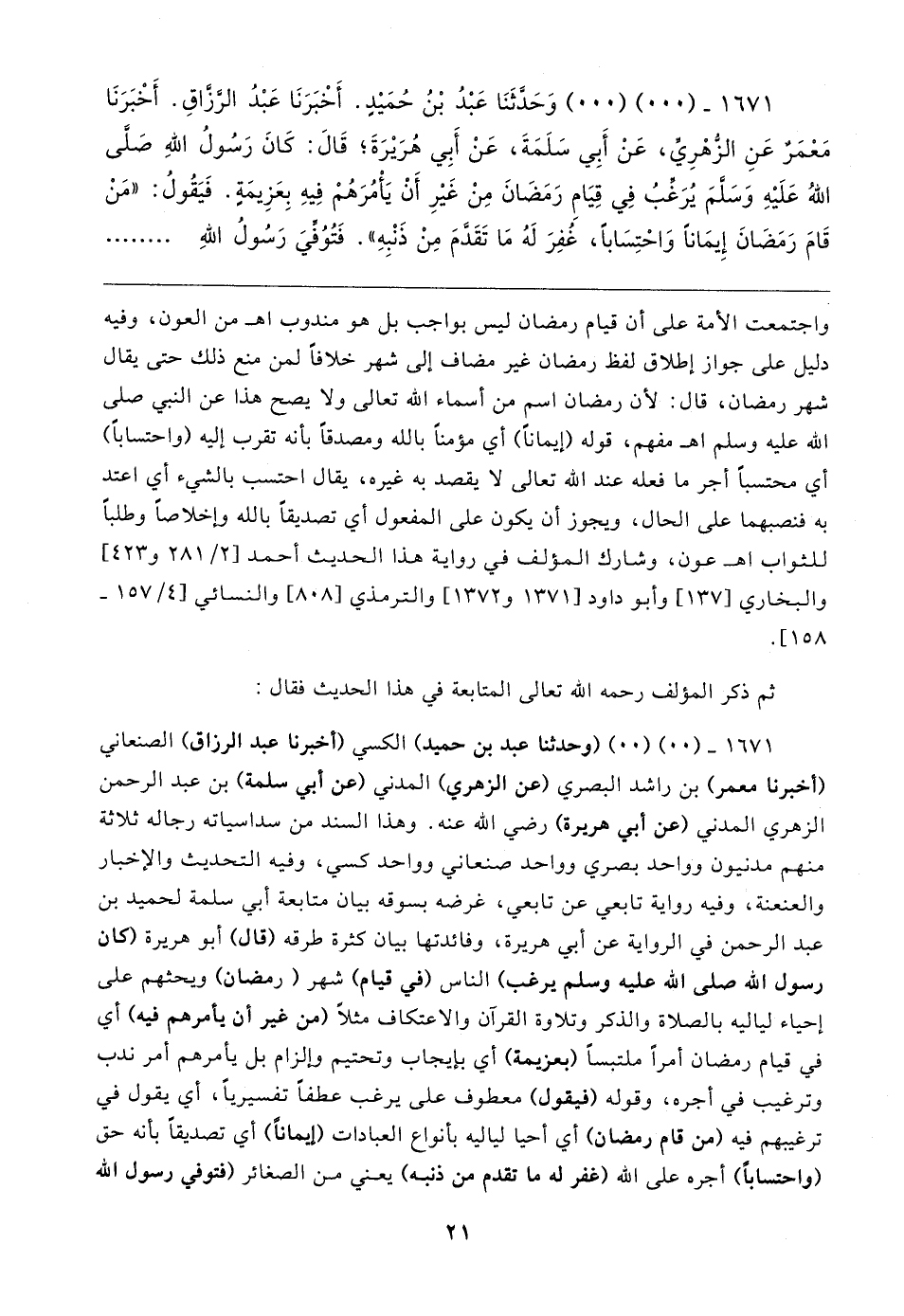 ١٦٧١ - (٠٠) (٠٠) وَحَدَّثَنَا عَبْدُ بْنُ حُمَيدٍ. أَخْبَرَنَا عَبْدُ الرزاقِ. أَخْبَرَنَا مَعْمَرٌ عَنِ الزهْرِي، عَنْ أَبِي سَلَمَةَ، عَنْ أَبِي هُرَيرَةَ؛ قَال: كَانَ رَسُولُ اللهِ صَلَّى اللهُ عَلَيهِ وَسَلمَ يُرَغِّبُ فِي قِيَامِ رَمَضَانَ مِنْ غَيرِ أَنْ يَأْمُرَهُمْ فِيهِ بِعَزِيمَةٍ. فَيَقُولُ: "مَنْ قَامَ رَمَضَانَ إِيمَانا وَاحْتِسَابا، غُفِرَ لَهُ مَا تَقَدمَ مِنْ ذَنْبِهِ". فَتُوُفِّيَ رَسُولُ اللهِ