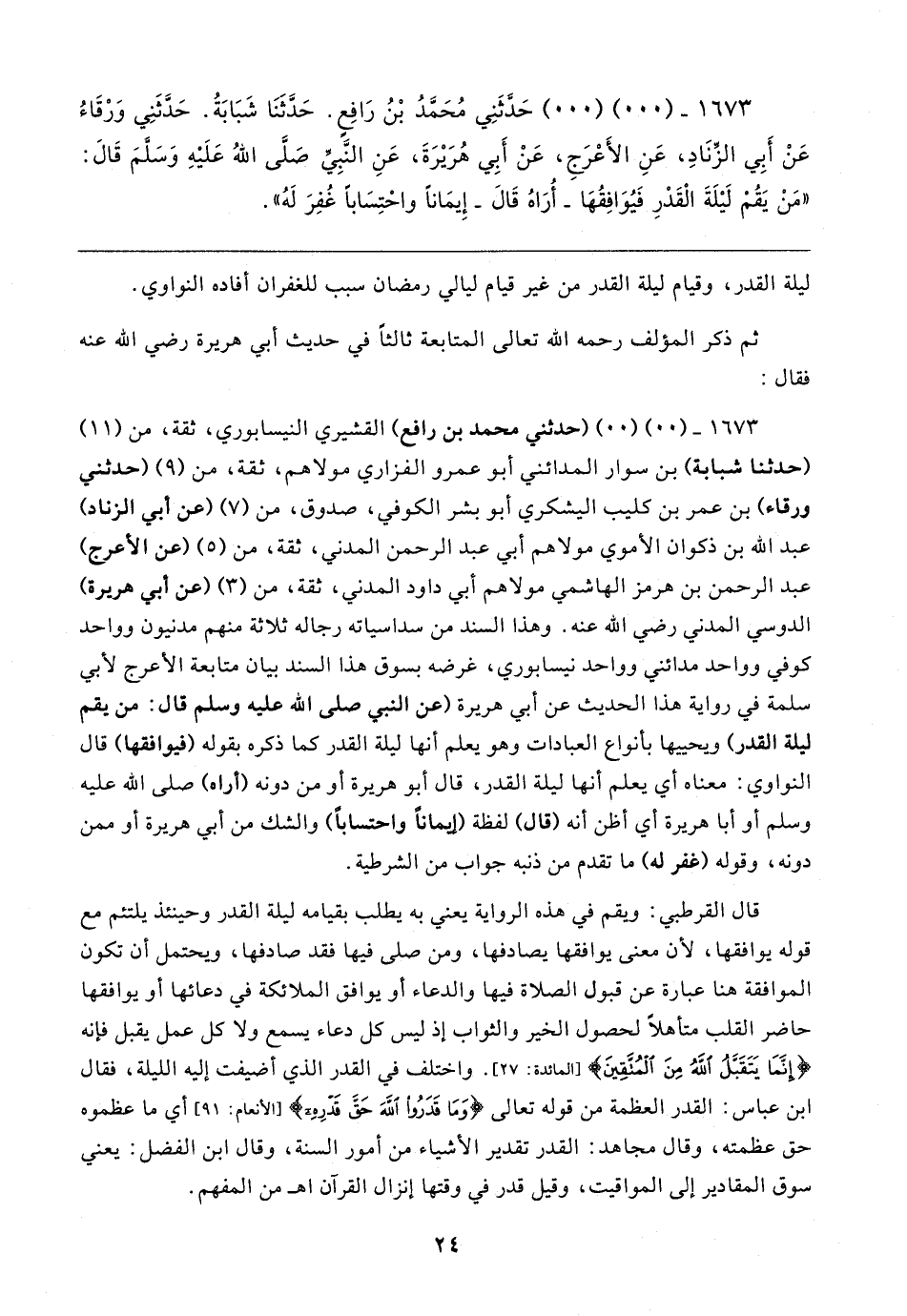 ١٦٧٣ - (٠٠) (٠٠) (حدثني محمد بن رافع) القشيري النيسابوري، ثقة، من (١١) (حدثنا شبابة) بن سوار المدائني أبو عمرو الفزاري مولاهم، ثقة، من (٩) (حدثني ورقاء) بن عمر بن كليب اليشكري أبو بشر الكوفي، صدوق، من (٧) (عن أبي الزناد) عبد الله بن ذكوان الأموي مولاهم أبي عبد الرحمن المدني، ثقة، من (٥) (عن الأعرج) عبد الرحمن بن هرمز الهاشمي مولاهم أبي داود المدني، ثقة، من (٣) (عن أبي هريرة) الدوسي المدني رضي الله عنه. وهذا السند من سداسياته رجاله ثلاثة منهم مدنيون وواحد كوفي وواحد مدائني وواحد نيسابوري، غرضه بسوق هذا السند بيان متابعة الأعرج لأبي سلمة في رواية هذا الحديث عن أبي هريرة (عن النبي صلى الله عليه وسلم قال: من يقم ليلة القدر) ويحييها بأنواع العبادات وهو يعلم أنها ليلة القدر كما ذكره بقوله (فيوافقها) قال النواوي: معناه أي يعلم أنها ليلة القدر، قال أبو هريرة أو من دونه (أراه) صلى الله عليه وسلم أو أبا هريرة أي أظن أنه (قال) لفظة (إيمانًا واحتسابًا) والشك من أبي هريرة أو ممن دونه، وقوله (غفر له) ما تقدم من ذنبه جواب من الشرطية.