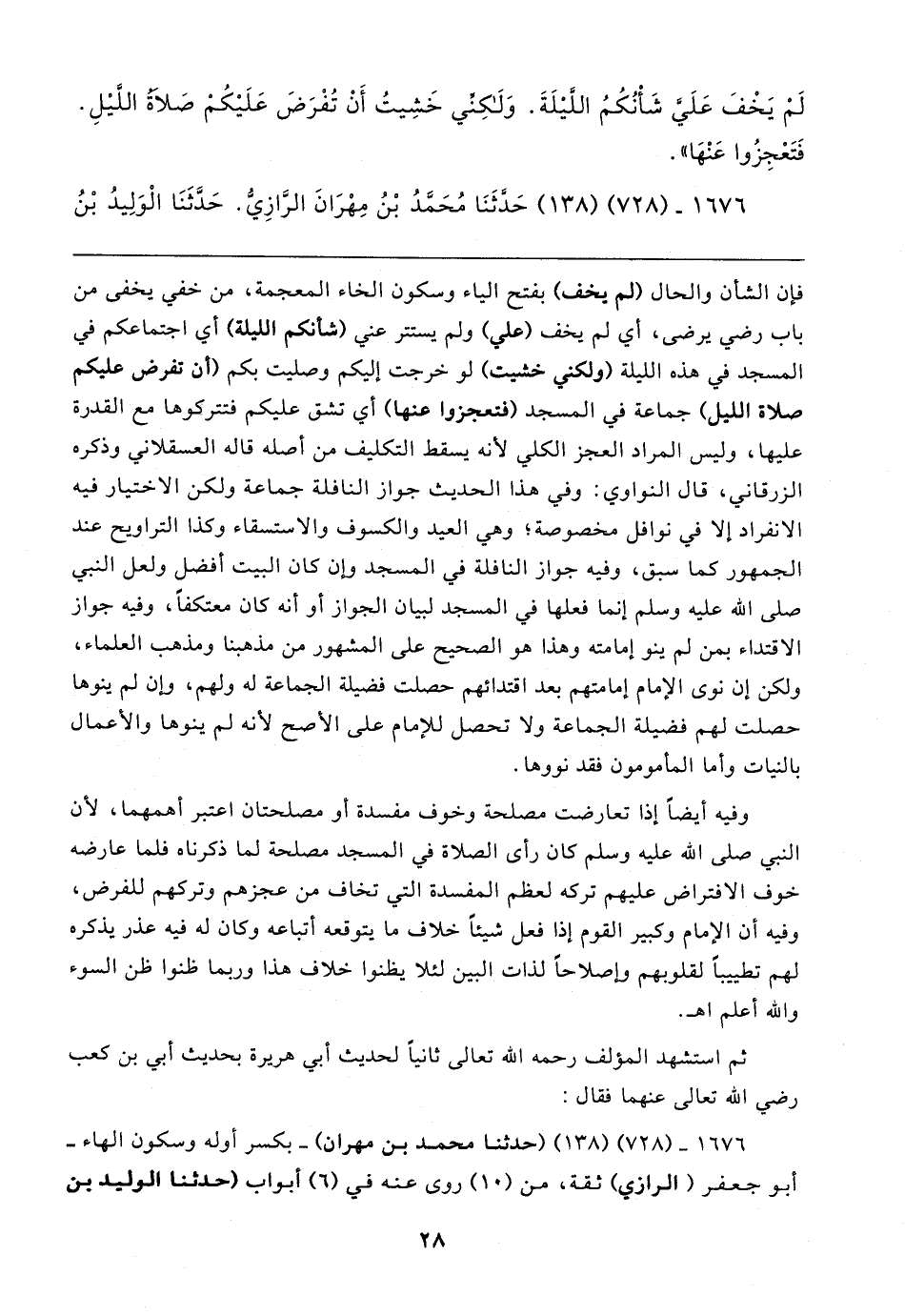 لَمْ يَخْفَ عَلَى شَأْنُكُمُ الليلَةَ. وَلكِنِّي خَشِيتُ أَنْ تُفْرَضَ عَلَيكُمْ صَلاةَ الليلِ. فَتَعْجِزُوا عَنْهَا".
