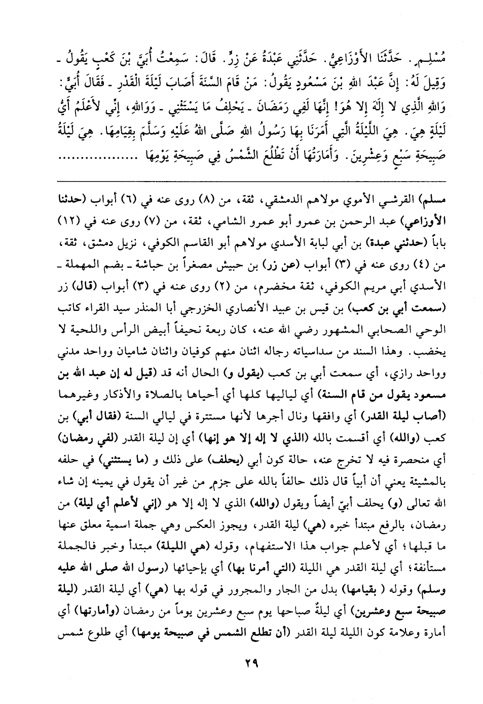 مُسْلِم. حَدَّثنَا الأَوْزَاعي. حَدثَنِي عَبْدَةُ عَنْ زِرٍّ. قَال: سَمِعْتُ أبَيَّ بْنَ كَعْبٍ يَقُولُ -وَقِيلَ لَهُ: إِنَّ عَبْدَ اللهِ بْنَ مَسْعُودِ يَقُولُ: مَنْ قَامَ السَّنَةَ أَصَابَ لَيلَةَ الْقَدْرِ- فَقَال أُبَي: وَاللهِ الذِي لا إِلَهَ إِلا هُوَ! إِنَّهَا لَفِي رَمَضَانَ -يَحْلِفُ مَا يَسْتَثْنِي- وَوَاللهِ، إِني لأَعلَمُ أَيُّ لَيلَةٍ هِيَ. هِيَ الليلَةُ التِي أمَرَنَا بِهَا رَسُولُ اللهِ صَلى اللهُ عَلَيهِ وَسَلمَ بِقِيَامِهَا. هِيَ لَيلَةُ صَبِيحَةِ سَبْعٍ وَعِشْرِينَ. وَأَمَارَتُهَا أَنْ تَطْلُعَ الشَّمْسُ فِي صَبِيحَةِ يَوْمِهَا