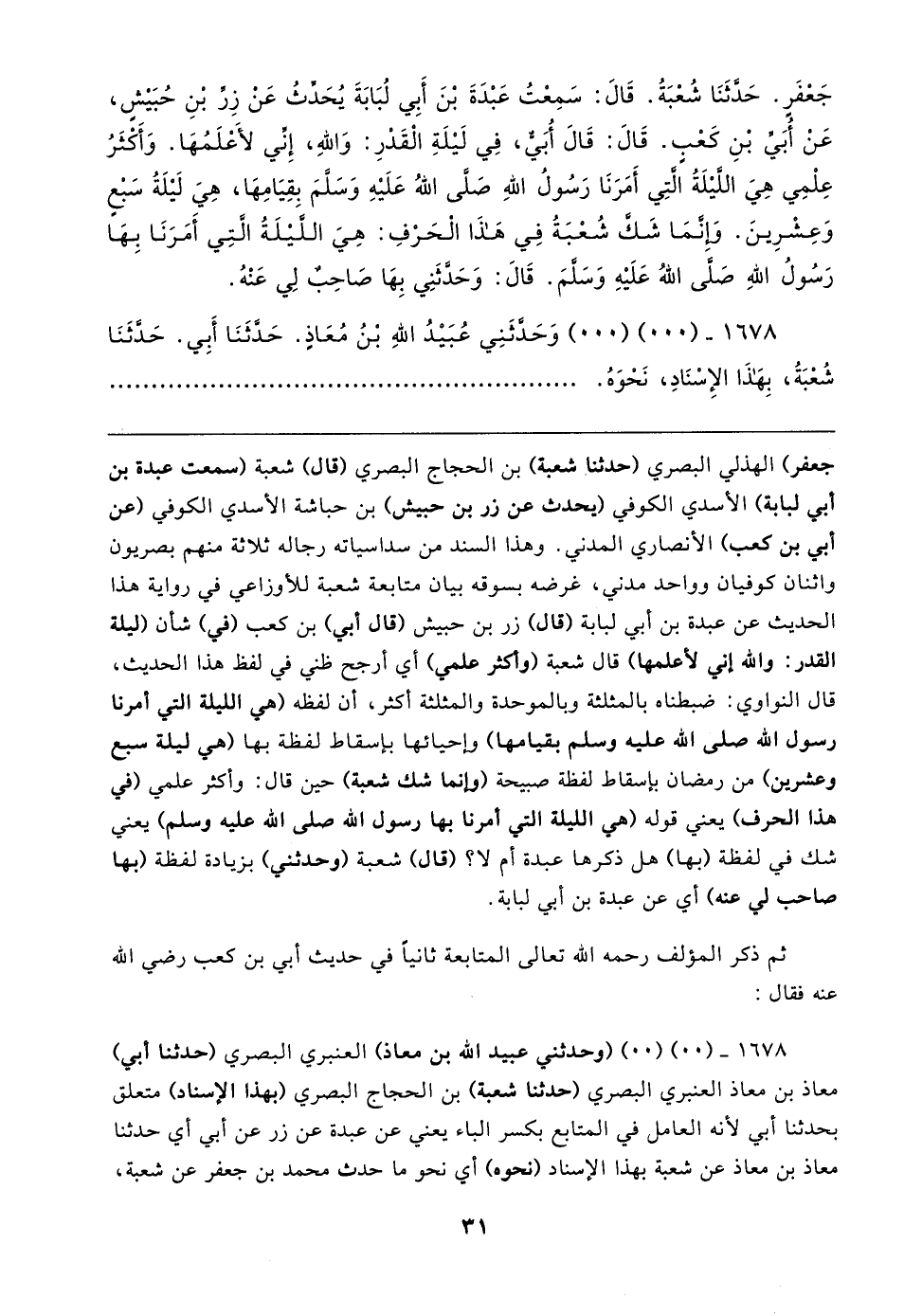 جَعْفَرٍ. حَدَّثَنَا شُعْبَةُ. قَال: سَمِعْتُ عَبْدَةَ بْنَ أبِي لُبَابَةَ يُحَدِّثُ عَن زِرِّ بْنِ حُبَيشٍ، عَنْ أُبَيِّ بْنِ كَعْبٍ. قَال: قَال أُبَي، فِي لَيلَةِ الْقَدْرِ: وَاللهِ، إِني لأَعْلَمُهَا. وَأكْثَرُ عِلْمِي هِيَ الليلَةُ التِي أَمَرَنَا رَسُولُ اللهِ صَلى اللهُ عَلَيهِ وَسَلمَ بِقِيَامِهَا، هِيَ لَيلَةُ سَبْع وَعِشْرِينَ. وَإِنَّمَا شَكَّ شُعْبَةُ فِي هَذا الحَرْفِ: هِيَ الليلَةُ التِي أمَرَنَا بِهَا رَسُولُ اللهِ صَلى اللهُ عَلَيهِ وَسَلمَ. قَال: وَحَدثَنِي بِهَا صَاحِبٌ لِي عَنْهُ.