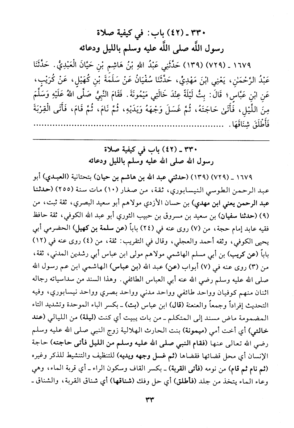 ١٦٧٩ - (٧٢٩) (١٣٩) حَدَّثَنِي عَبْدُ اللهِ بْنُ هَاشِمِ بْنِ حَيانَ الْعَبْدِيُّ. حَدَّثَنَا عَبْدُ الرحْمَنِ، يَعْنِي ابْنَ مَهْدِي، حَدَّثَنَا سُفْيَانُ عَنْ سَلَمَةَ بْنِ كُهَيلٍ، عَنْ كُرَيب، عَنِ ابْنِ عَباس؛ قَال: بِتُّ لَيلَةً عِنْدَ خَالتِي مَيمُونَةَ. فَقَامَ النَّبِيّ صَلى اللهُ عَلَيهِ وَسَلمَ مِنَ الليلِ، فَأَتَى حَاجَتَهُ، ثُم غَسَلَ وَجْهَهُ ويدَيهِ، ثُم نَامَ، ثُم قَامَ، فَأَتَى الْقِرْبَةَ فَأَطْلَقَ شِنَاقَهَا