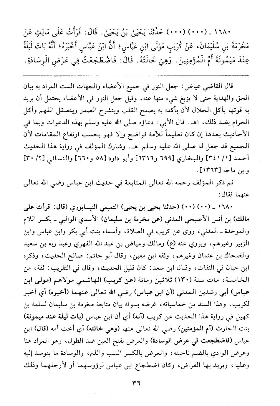 ١٦٨٠ - (٠٠) (٠٠) حَدَّثَنَا يَحْيَى بْنُ يَحْيَى. قَال: قَرَاتُ عَلَى مَالِكٍ عَنْ مَخْرَمَةَ بْنِ سُلَيمَانَ، عَنْ كُرَيب مَوْلَى ابْنِ عَباسٍ؛ أَنَّ ابْنَ عَبَّاسٍ أَخْبَرَهُ؛ أَنَّهُ بَاتَ لَيلَةً عِنْدَ مَيمُونَةَ أم الْمُؤْمِنِينَ. وَهِيَ خَالتُهُ. قَال: فَاضْطَجَعْتُ فِي عَرْضِ الْوسَادَةِ