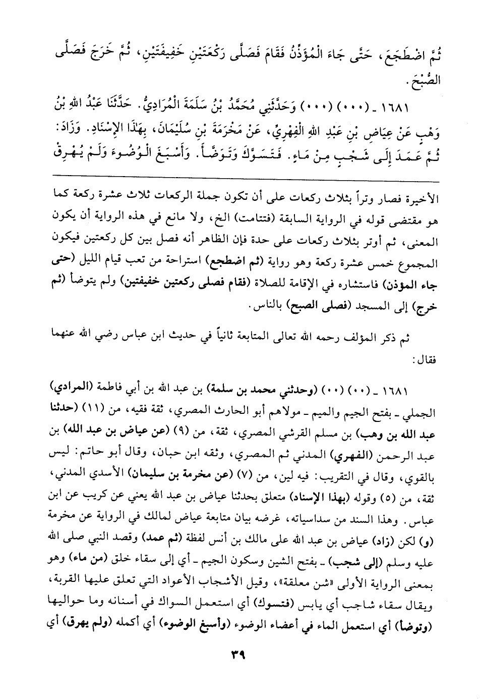 ١٦٨١ - (٠٠) (٠٠) (وحدثني محمد بن سلمة) بن عبد الله بن أبي فاطمة (المرادي) الجملي -بفتح الجيم والميم- مولاهم أبو الحارث المصري، ثقة فقيه، من (١١) (حدثنا عبد الله بن وهب) بن مسلم القرشي المصري، ثقة، من (٩) (عن عياض بن عبد الله) بن عبد الرحمن (الفهري) المدني ثم المصري، وثقه ابن حبان، وقال أبو حاتم: ليس بالقوي، وقال في التقريب: فيه لين، من (٧) (عن مخرمة بن سليمان) الأسدي المدني، ثقة، من (٥) وقوله (بهذا الإسناد) متعلق بحدثنا عياض بن عبد الله يعني عن كريب عن ابن عباس. وهذا السند من سداسياته، غرضه بيان متابعة عياض لمالك في الرواية عن مخرمة (و) لكن (زاد) عياض بن عبد الله على مالك بن أنس لفظة (ثم عمد) وقصد النبي صلى الله عليه وسلم (إلى شجب) -بفتح الشين وسكون الجيم- أي إلى سقاء خلق (من ماء) وهو بمعنى الرواية الأولى "شن معلقة"، وقيل الأشجاب الأعواد التي تعلق عليها القربة، ويقال سقاء شاجب أي يابس (فتسوك) أي استعمل السواك في أسنانه وما حواليها (وتوضأ) أي استعمل الماء في أعضاء الوضوء (وأسبغ الوضوء) أي أكمله (ولم يهرق) أي