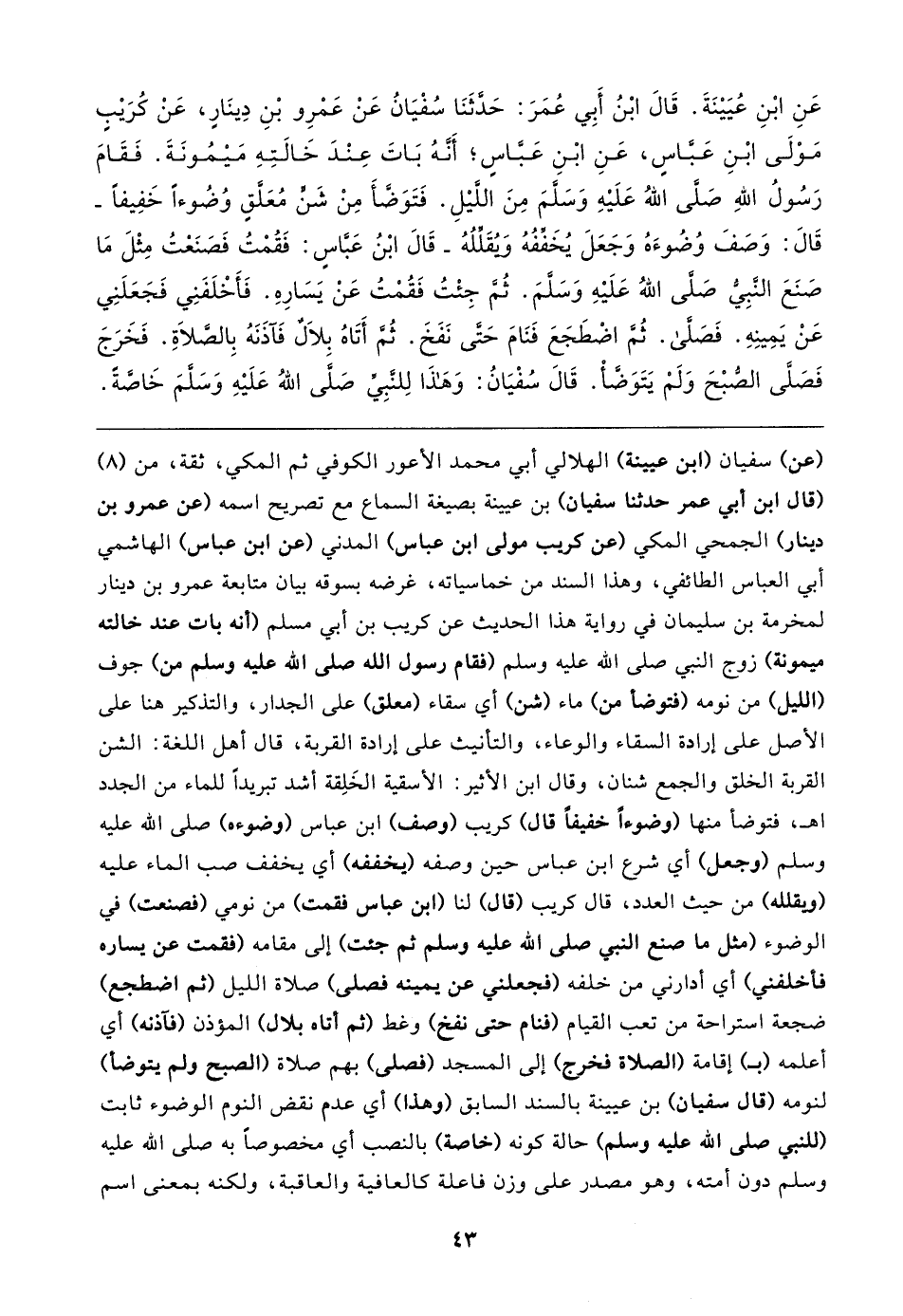 عَنِ ابْنِ عُيَينَةَ. قَال ابْنُ أَبِي عُمَرَ: حَدَّثَنَا سُفْيَانُ عَنْ عَمْرِو بْنِ دِينَارٍ، عَنْ كُرَيبٍ مَوْلَى ابْنِ عَبَّاسٍ، عَنِ ابْنِ عَبَّاسٍ؛ أَنَّهُ بَاتَ عِنْدَ خَالتِهِ مَيمُونَةَ. فَقَامَ رَسُولُ اللهِ صَلَّى اللهُ عَلَيهِ وَسَلَّمَ مِنَ اللَّيلِ. فَتَوَضَّأَ مِنْ شَنٍّ مُعَلِّقٍ وُضُوءًا خَفِيفًا - قَال: وَصَفَ وُضُوءَهُ وَجَعَلَ يُخَففُهُ ويقَلِّلُهُ - قَال ابْنُ عَبَّاسٍ: فَقُمْتُ فَصَنَعْتُ مِثْلَ مَا صَنَعَ النَّبِيُّ صَلَّى اللهُ عَلَيهِ وَسَلَّمَ. ثُمَّ جِئْتُ فَقُمْتُ عَنْ يَسَارِهِ. فَأَخْلَفَنِي فَجَعَلَنِي عَنْ يَمِينِهِ. فَصَلَّى. ثُمَّ اضْطَجَعَ فَنَامَ حَتَّى نَفَخَ. ثُمَّ أَتَاهُ بلالٌ فَآذَنَهُ بِالصَّلاةِ. فَخَرَجَ فَصَلَّى الصُّبْحَ وَلَمْ يَتَوَضَّأْ. قَال سُفْيَانُ: وَهَذَا لِلنَّبِيِّ صَلَّى اللهُ عَلَيهِ وَسَلَّمَ خَاصَّةً