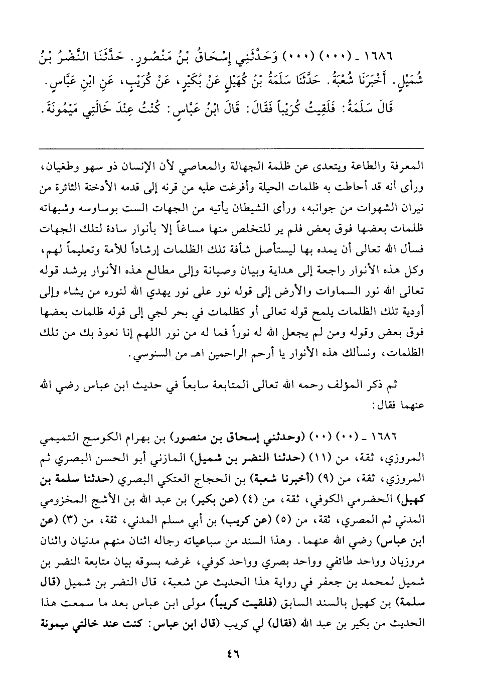 ١٦٨٦ - (٠٠) (٠٠) (وحدثني إسحاق بن منصور) بن بهرام الكوسج التميمي المروزي، ثقة، من (١١) (حدثنا النضر بن شميل) المازني أبو الحسن البصري ثم المروزي، ثقة، من (٩) (أخبرنا شعبة) بن الحجاج العتكي البصري (حدثنا سلمة بن كهيل) الحضرمي الكوفي، ثقة، من (٤) (عن بكير) بن عبد الله بن الأشج المخزومي المدني ثم المصري، ثقة، من (٥) (عن كريب) بن أبي مسلم المدني، ثقة، من (٣) (عن ابن عباس) رضي الله عنهما. وهذا السند من سباعياته رجاله اثنان منهم مدنيان واثنان مروزيان وواحد طائفي وواحد بصري وواحد كوفي، غرضه بسوقه بيان متابعة النضر بن شميل لمحمد بن جعفر في رواية هذا الحديث عن شعبة، قال النضر بن شميل (قال سلمة) بن كهيل بالسند السابق (فلقيت كريبًا) مولى ابن عباس بعد ما سمعت هذا الحديث من بكير بن عبد الله (فقال) لي كريب (قال ابن عباس: كنت عند خالتي ميمونة