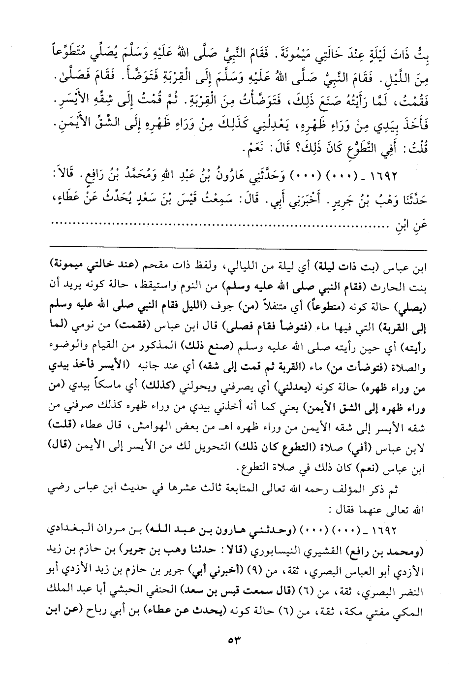 بِتُّ ذَاتَ لَيلَةٍ عِنْدَ خَالتِي مَيمُونَةَ. فَقَامَ النَّبِيُّ صَلَّى اللهُ عَلَيهِ وَسَلَّمَ يُصَلِّي مُتَطَوِّعًا مِنَ اللَّيلِ. فَقَامَ النبِي صَلَّى اللهُ عَلَيهِ وَسَلَّمَ إِلَى الْقِرْبَةِ فَتَوَضَّأَ. فَقَامَ فَصَلَّى. فَقُمْتُ، لَمَّا رَأَيتُهُ صَنَعَ ذَلِكَ، فَتَوَضَّأْتُ مِنَ الْقِرْبَةِ. ثُمَّ قُصْتُ إِلَى شِقِّهِ الأَيسَرِ. فَأَخَذَ بِيَدِي مِنْ وَرَاءِ ظَهْرِهِ، يَعْدِلُنِي كَذَلِكَ مِنْ وَرَاءِ ظَهْرِهِ إِلَى الشِّقِّ الأَيمَنِ. قُلْتُ: أَفِي التَّطَوُّعِ كَانَ ذَلِكَ؟ قَال: نَعَمْ.