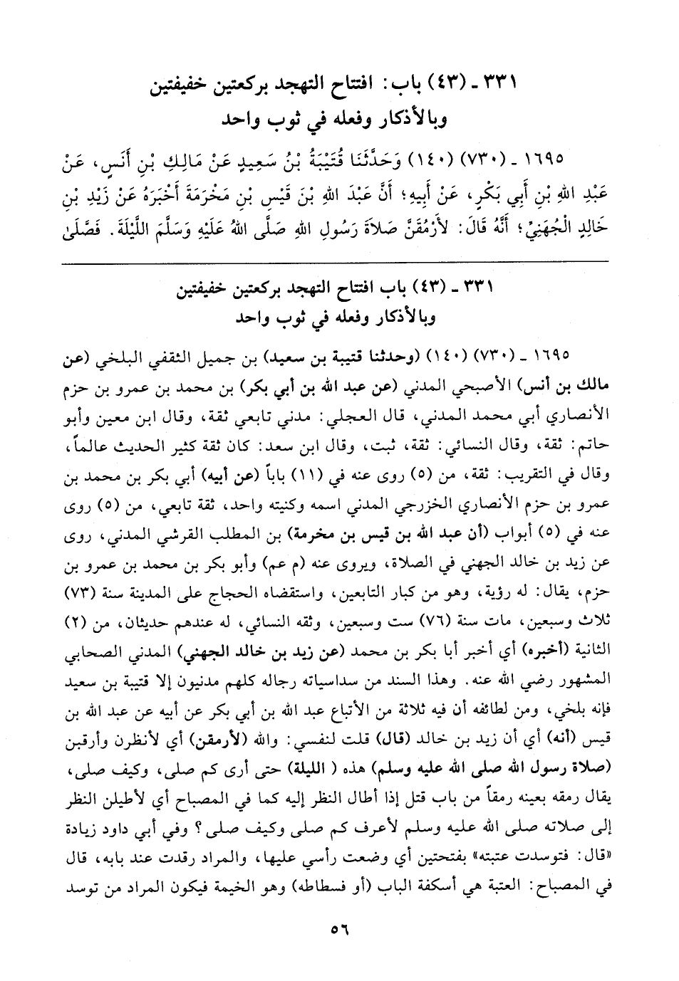 ١٦٩٥ - (٧٣٠) (١٤٠) (وحدثنا قتيبة بن سعيد) بن جميل الثقفي البلخي (عن مالك بن أنس) الأصبحي المدني (عن عبد الله بن أبي بكر) بن محمد بن عمرو بن حزم الأنصاري أبي محمد المدني، قال العجلي: مدني تابعي ثقة، وقال ابن معين وأبو حاتم: ثقة، وقال النسائي: ثقة، ثبت، وقال ابن سعد: كان ثقة كثير الحديث عالمًا، وقال في التقريب: ثقة، من (٥) روى عنه في (١١) بابا (عن أبيه) أبي بكر بن محمد بن عمرو بن حزم الأنصاري الخزرجي المدني اسمه وكنيته واحد، ثقة تابعي، من (٥) روى عنه في (٥) أبواب (أن عبد الله بن قبس بن مخرمة) بن المطلب القرشي المدني، روى عن زيد بن خالد الجهني في الصلاة، ويروى عنه (م عم) وأبو بكر بن محمد بن عمرو بن حزم، يقال: له رؤية، وهو من كبار التابعين، واستقضاه الحجاج على المدينة سنة (٧٣) ثلاث وسبعين، مات سنة (٧٦) ست وسبعين، وثقه النسائي، له عندهم حديثان، من (٢) الثانية (أخبره) أي أخبر أبا بكر بن محمد (عن زيد بن خالد الجهني) المدني الصحابي المشهور رضي الله عنه. وهذا السند من سداسياته رجاله كلهم مدنيون إلَّا قتيبة بن سعيد فإنه بلخي، ومن لطائفه أن فيه ثلاثة من الأتباع عبد الله بن أبي بكر عن أبيه عن عبد الله بن قيس (أنه) أي أن زيد بن خالد (قال) قلت لنفسي: والله (لأرمقن) أي لأنظرن وأرقبن (صلاة رسول الله صلى الله عليه وسلم) هذه (الليلة) حتى أرى كم صلى، وكيف صلى، يقال رمقه بعينه رمقًا من باب قتل إذا أطال النظر إليه كما في المصباح أي لأطيلن النظر إلى صلاته صلى الله عليه وسلم لأعرف كم صلى وكيف صلى؟ وفي أبي داود زيادة "قال: فتوسدت عتبته" بفتحتين أي وضعت رأسي عليها، والمراد رقدت عند بابه، قال في المصباح: العتبة هي أسكفة الباب (أو فسطاطه) وهو الخيمة فيكون المراد من توسد