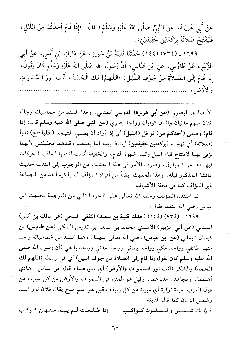 ١٦٩٩ - (٧٣٤) (١٤٤) حَدَّثَنَا قُتَيبَةُ بْنُ سَعِيدٍ، عَنْ مَالِكِ بْنِ أَنَسٍ، عَنْ أَبِي الزُّبَيرِ، عَنْ طَاوُسٍ، عَنِ ابْنِ عَبَّاسٍ؛ أَنَّ رَسُولَ اللهِ صَلَّى اللهُ عَلَيهِ وَسَلَّمَ كَانَ يَقُولُ، إِذَا قَامَ إِلَى الصَّلاةِ مِنْ جَوْفِ اللَّيلِ: "اللَّهمَّ! لَكَ الْحَمْدُ، أَنْتَ نُورُ السَّموَاتِ وَالأرضِ،