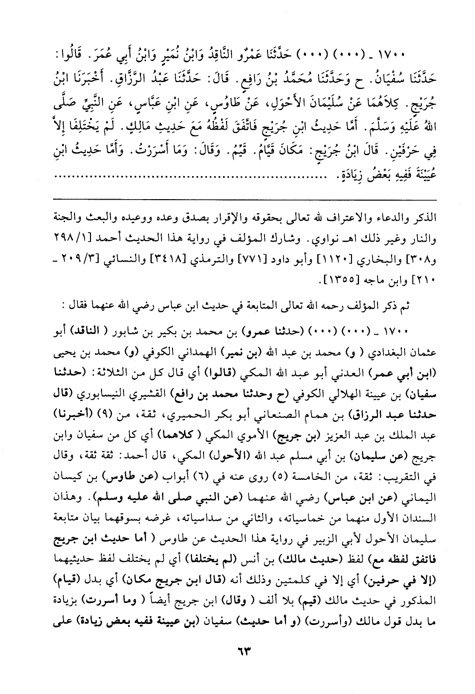 ١٧٠٠ - (٠٠) (٠٠) (حدثنا عمرو) بن محمد بن بكير بن شابور (الناقد) أبو عثمان البغدادي (و) محمد بن عبد الله (بن نمير) الهمداني الكوفي (و) محمد بن يحيى (ابن أبي عمر) العدني أبو عبد الله المكي (قالوا) أي قال كل من الثلاثة: (حدثنا سفيان) بن عيينة الهلالي الكوفي (ح وحدثنا محمد بن رافع) القشيري النيسابوري (قال حدثنا عبد الرزاق) بن همام الصنعاني أبو بكر الحميري، ثقة، من (٩) (أخبرنا) عبد الملك بن عبد العزيز (بن جريج) الأموي المكي (كلاهما) أي كل من سفيان وابن جريج (عن سليمان) بن أبي مسلم عبد الله (الأحول) المكي، قال أحمد: ثقة ثقة، وقال في التقريب: ثقة، من الخامسة (٥) روى عنه في (٦) أبواب (عن طاوس) بن كيسان اليماني (عن ابن عباس) رضي الله عنهما (عن النبي صلى الله عليه وسلم). وهذان السندان الأول منهما من خماسياته، والثاني من سداسياته، غرضه بسوقهما بيان متابعة سليمان الأحول لأبي الزبير في رواية هذا الحديث عن طاوس (أما حديث ابن جريج فاتفق لفظه مع) لفظ (حديث مالك) بن أنس (لم يختلفا) أي لم يختلف لفظ حديثيهما (إلا في حرفين) أي إلَّا في كلمتين وذلك أنه (قال ابن جريج مكان) أي بدل (قيام) المذكور في حديث مالك (قيم) بلا ألف (وقال) ابن جريج أيضًا (وما أسررت) بزيادة ما بدل قول مالك (وأسررت) (وأما حديث) سفيان (بن عيينة ففيه بعض زيادة) على