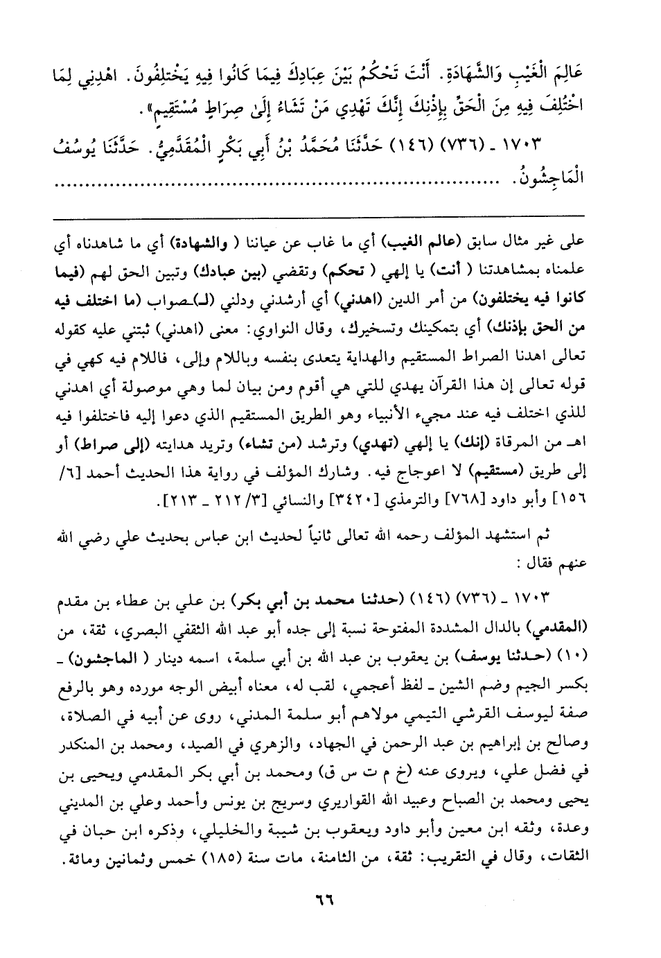 ١٧٠٣ - (٧٣٦) (١٤٦) (حدثنا محمد بن أبي بكر) بن علي بن عطاء بن مقدم (المقدمي) بالدال المشددة المفتوحة نسبة إلى جده أبو عبد الله الثقفي البصري، ثقة، من (١٠) (حدثنا يوسف) بن يعقوب بن عبد الله بن أبي سلمة، اسمه دينار (الماجشون) - بكسر الجيم وضم الشين - لفظ أعجمي، لقب له، معناه أبيض الوجه مورده وهو بالرفع صفة ليوسف القرشي التيمي مولاهم أبو سلمة المدني، روى عن أبيه في الصلاة، وصالح بن إبراهيم بن عبد الرحمن في الجهاد، والزهري في الصيد، ومحمد بن المنكدر في فضل علي، ويروى عنه (خ م ت س ق) ومحمد بن أبي بكر المقدمي ويحيى بن يحيى ومحمد بن الصباح وعبيد الله القواريري وسريج بن يونس وأحمد وعلي بن المديني وعدة، وثقه ابن معين وأبو داود ويعقوب بن شيبة والخليلي، وذكره ابن حبان في الثقات، وقال في التقريب: ثقة، من الثامنة، مات سنة (١٨٥) خمس وثمانين ومائة.