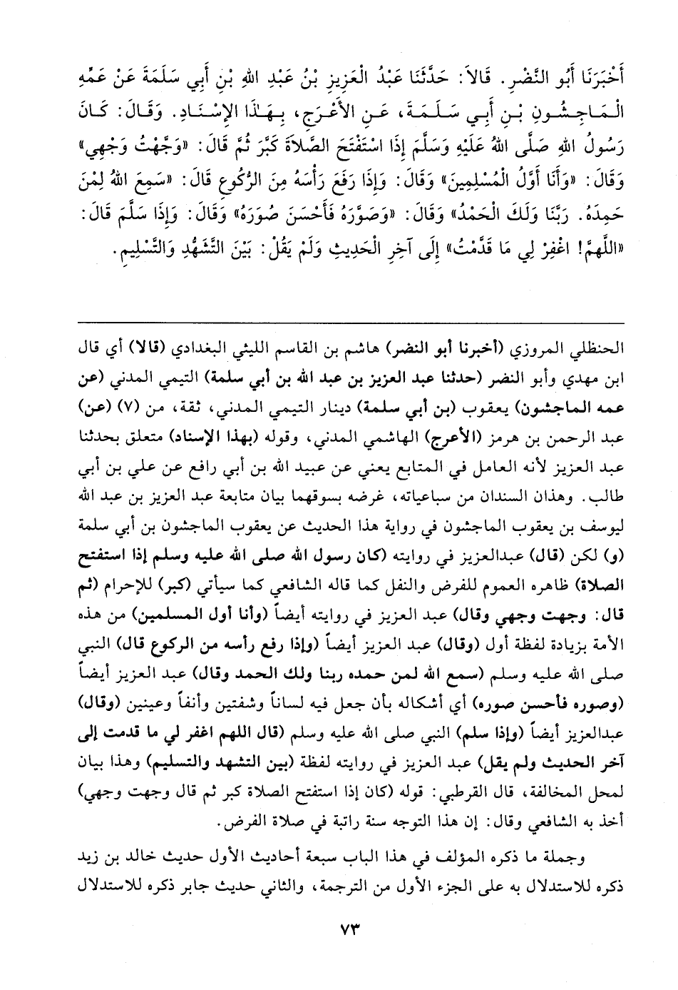 الحنظلي المروزي (أخبرنا أبو النضر) هاشم بن القاسم الليثي البغدادي (قالا) أي قال ابن مهدي وأبو النضر (حدثنا عبد العزيز بن عبد الله بن أبي سلمة) التيمي المدني (عن عمه الماجشون) يعقوب (بن أبي سلمة) دينار التيمي المدني، ثقة، من (٧) (عن) عبد الرحمن بن هرمز (الأعرج) الهاشمي المدني، وقوله (بهذا الإسناد) متعلق بحدثنا عبد العزيز لأنه العامل في المتابع يعني عن عبيد الله بن أبي رافع عن علي بن أبي طالب. وهذان السندان من سباعياته، غرضه بسوقهما بيان متابعة عبد العزيز بن عبد الله ليوسف بن يعقوب الماجشون في رواية هذا الحديث عن يعقوب الماجشون بن أبي سلمة (و) لكن (قال) عبد العزيز في روايته (كان رسول الله صلى الله عليه وسلم إذا استفتح الصلاة) ظاهره العموم للفرض والنفل كما قاله الشافعي كما سيأتي (كبر) للإحرام (ثم قال: وجهت وجهي وقال) عبد العزيز في روايته أيضًا (وأنا أول المسلمين) من هذه الأمة بزيادة لفظة أول (وقال) عبد العزيز أيضًا (وإذا رفع رأسه من الركوع قال) النبي صلى الله عليه وسلم (سمع الله لمن حمده ربنا ولك الحمد وقال) عبد العزيز أيضًا (وصوره فأحسن صوره) أي أشكاله بأن جعل فيه لسانًا وشفتين وأنفًا وعينين (وقال) عبد العزيز أيضًا (وإذا سلم) النبي صلى الله عليه وسلم (قال اللهم اغفر لي ما قدمت إلى آخر الحديث ولم يقل) عبد العزيز في روايته لفظة (بين التشهد والتسليم) وهذا بيان لمحل المخالفة، قال القرطبي: قوله (كان إذا استفتح الصلاة كبر ثم قال وجهت وجهي) أخذ به الشافعي وقال: إن هذا التوجه سنة راتبة في صلاة الفرض.