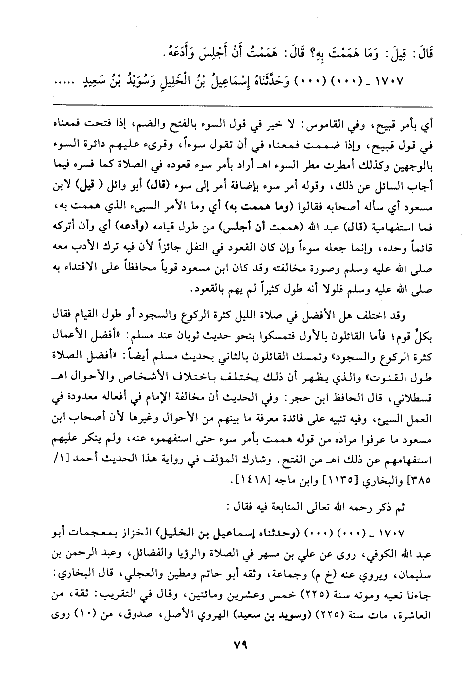 وقد اختلف هل الأفضل في صلاة الليل كثرة الركوع والسجود أو طول القيام فقال بكلٍّ قوم؛ فأما القائلون بالأول فتمسكوابنحو حديث ثوبان عند مسلم: "أفضل الأعمال كثرة الركوع والسجود" وتمسك القائلون بالثاني بحديث مسلم أيضًا: "أفضل الصلاة طول القنوت" والذي يظهر أن ذلك يختلف باختلاف الأشخاص والأحوال اهـ قسطلاني، قال الحافظ ابن حجر: وفي الحديث أن مخالفة الإمام في أفعاله معدودة في العمل السيئ، وفيه تنبيه على فائدة معرفة ما بينهم من الأحوال وغيرها لأن أصحاب ابن مسعود ما عرفوا مراده من قوله هممت بأمر سوء حتى استفهموه عنه، ولم ينكر عليهم استفهامهم عن ذلك اهـ من الفتح. وشارك المؤلف في رواية هذا الحديث أحمد [١/ ٣٨٥] والبخاري [١١٣٥] وابن ماجه [١٤١٨].