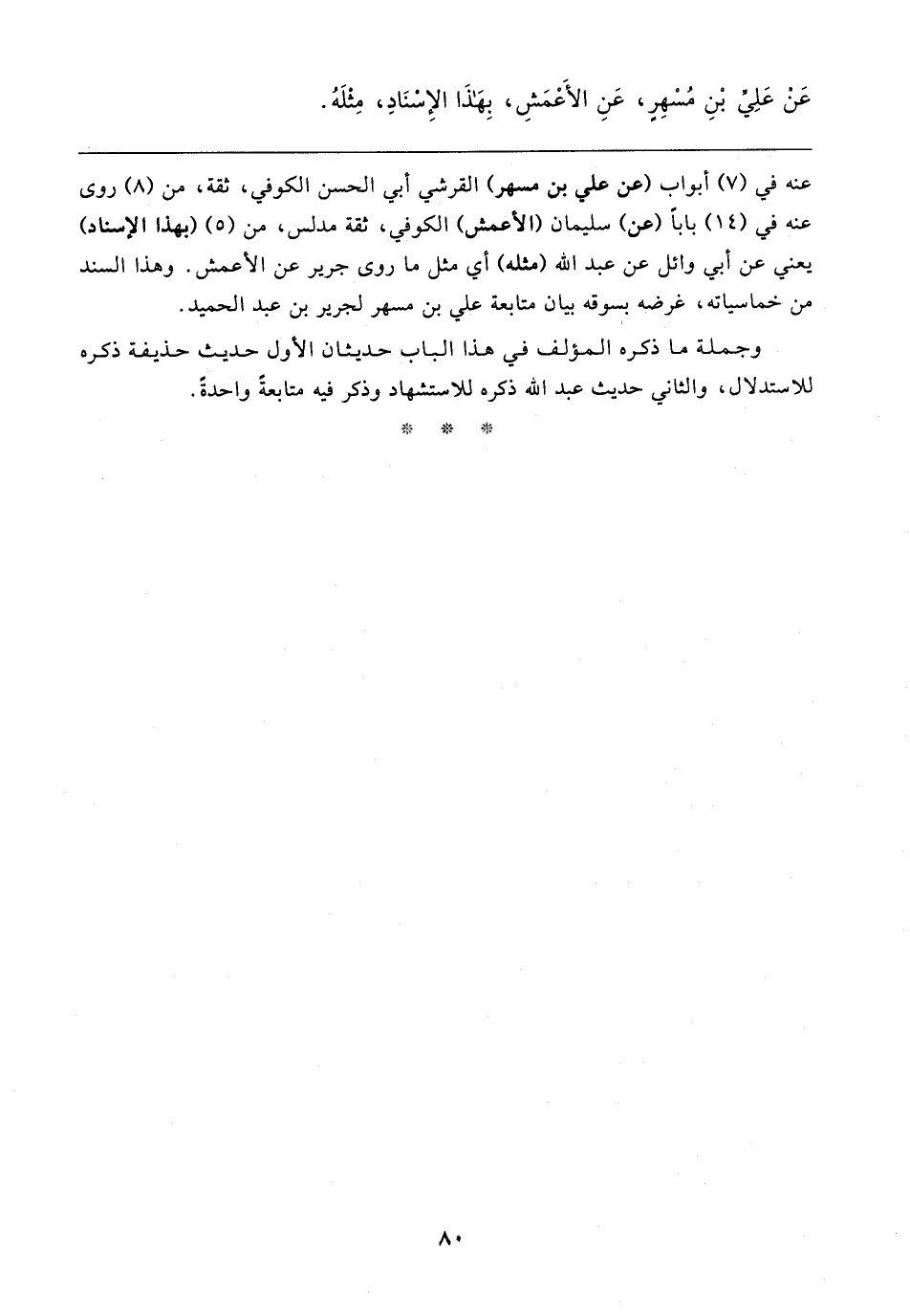 عنه في (٧) أبواب (عن علي بن مسهر) القرشي أبي الحسن الكوفي، ثقة، من (٨) روى عنه في (١٤) بابا (عن) سليمان (الأعمش) الكوفي، ثقة مدلس، من (٥) (بهذا الإسناد) يعني عن أبي وائل عن عبد الله (مثله) أي مثل ما روى جرير عن الأعمش. وهذا السند من خماسياته، غرضه بسوقه بيان متابعة علي بن مسهر لجرير بن عبد الحميد.