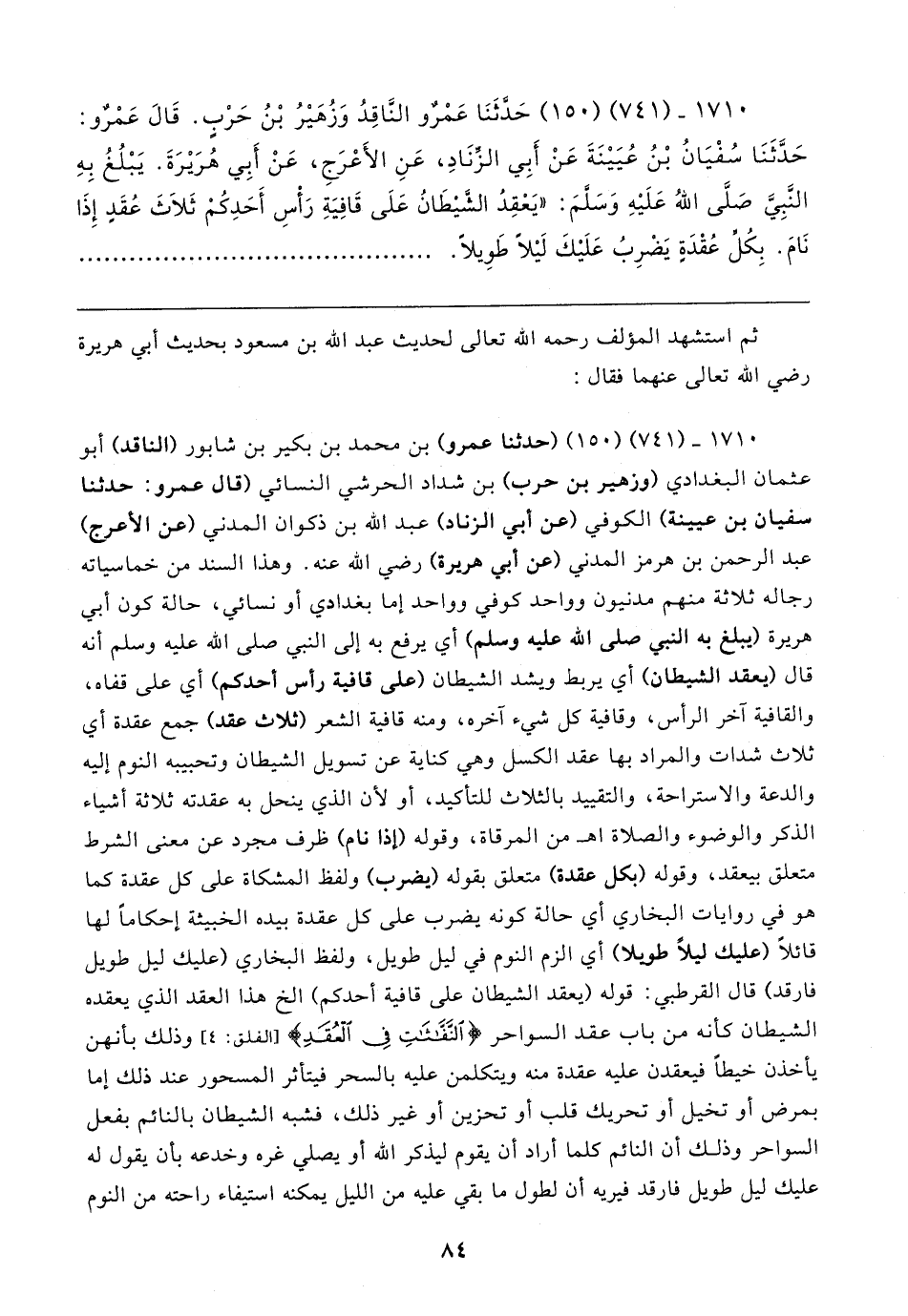 ١٧١٠ - (٧٤١) (١٥٠) حَدَّثَنَا عَمْرٌو النَّاقِدُ وَزُهَيرُ بْنُ حَرْبٍ. قَال عَمْرٌو: حَدَّثَنَا سُفْيَانُ بْنُ عُيَينَةَ عَنْ أَبِي الزِّنَادِ، عَنِ الأَعْرَجِ، عَنْ أَبِي هُرَيرَةَ. يَبْلُغُ بِهِ النَّبِيَّ صَلَّى اللهُ عَلَيهِ وَسَلَّمَ: "يَعْقِدُ الشَيطَانُ عَلَى قَافِيَةِ رَأْسِ أَحَدِكُمْ ثَلاثَ عُقَدٍ إِذَا نَامَ. بِكُلِّ عُقْدَةٍ يَضْرِبُ عَلَيكَ لَيلًا طَويلًا