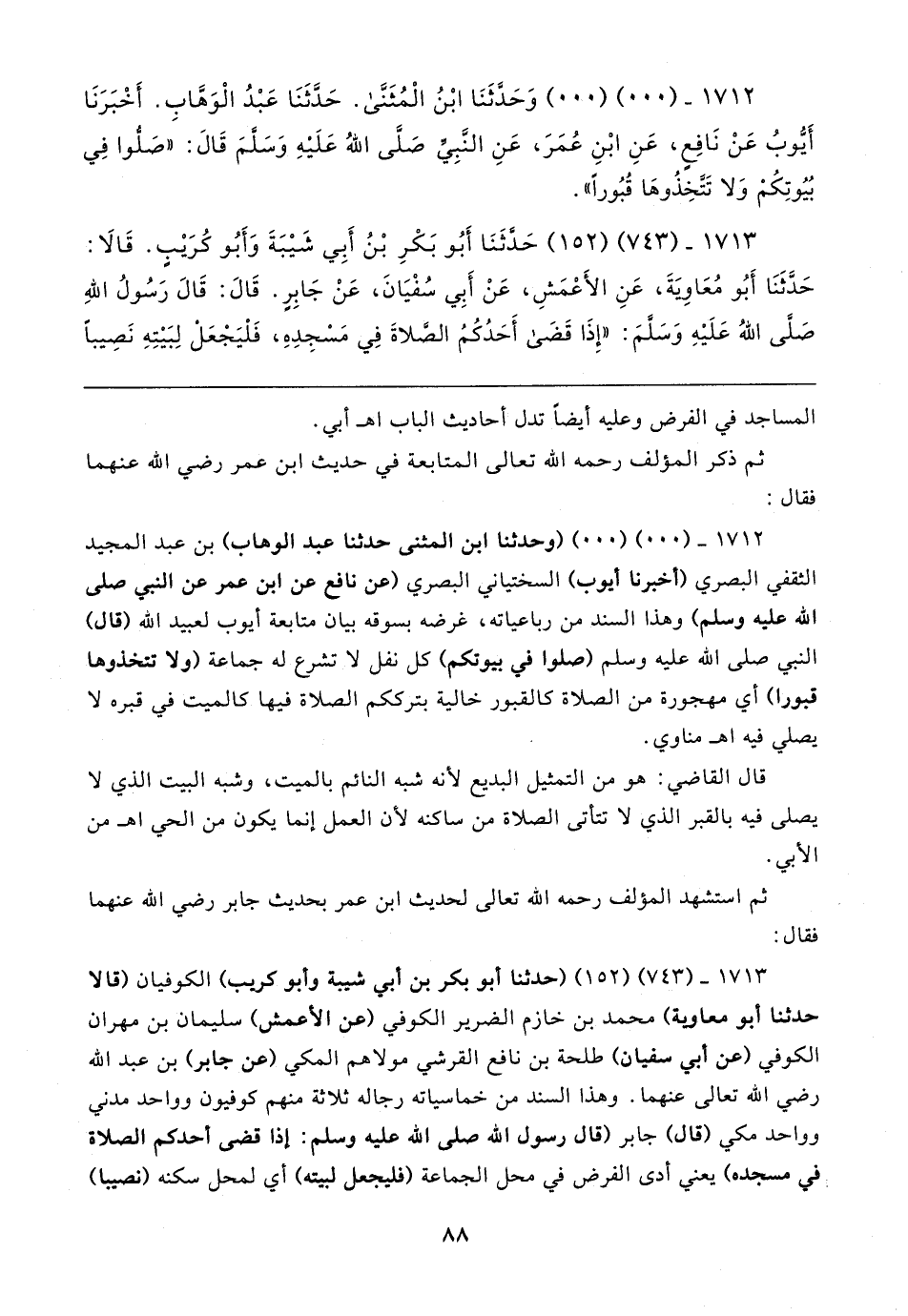 ١٧١٢ - (٠٠) (٠٠) (وحدثنا ابن المثنى حدثنا عبد الوهاب) بن عبد المجيد الثقفي البصري (أخبرنا أيوب) السختياني البصري (عن نافع عن ابن عمر عن النبي صلى الله عليه وسلم) وهذا السند من رباعياته، غرضه بسوقه بيان متابعة أيوب لعبيد الله (قال) النبي صلى الله عليه وسلم (صلوا في بيوتكم) كل نفل لا تشرع له جماعة (ولا تتخذوها قبورا) أي مهجورة من الصلاة كالقبور خالية بترككم الصلاة فيها كالميت في قبره لا يصلي فيه اهـ مناوي.