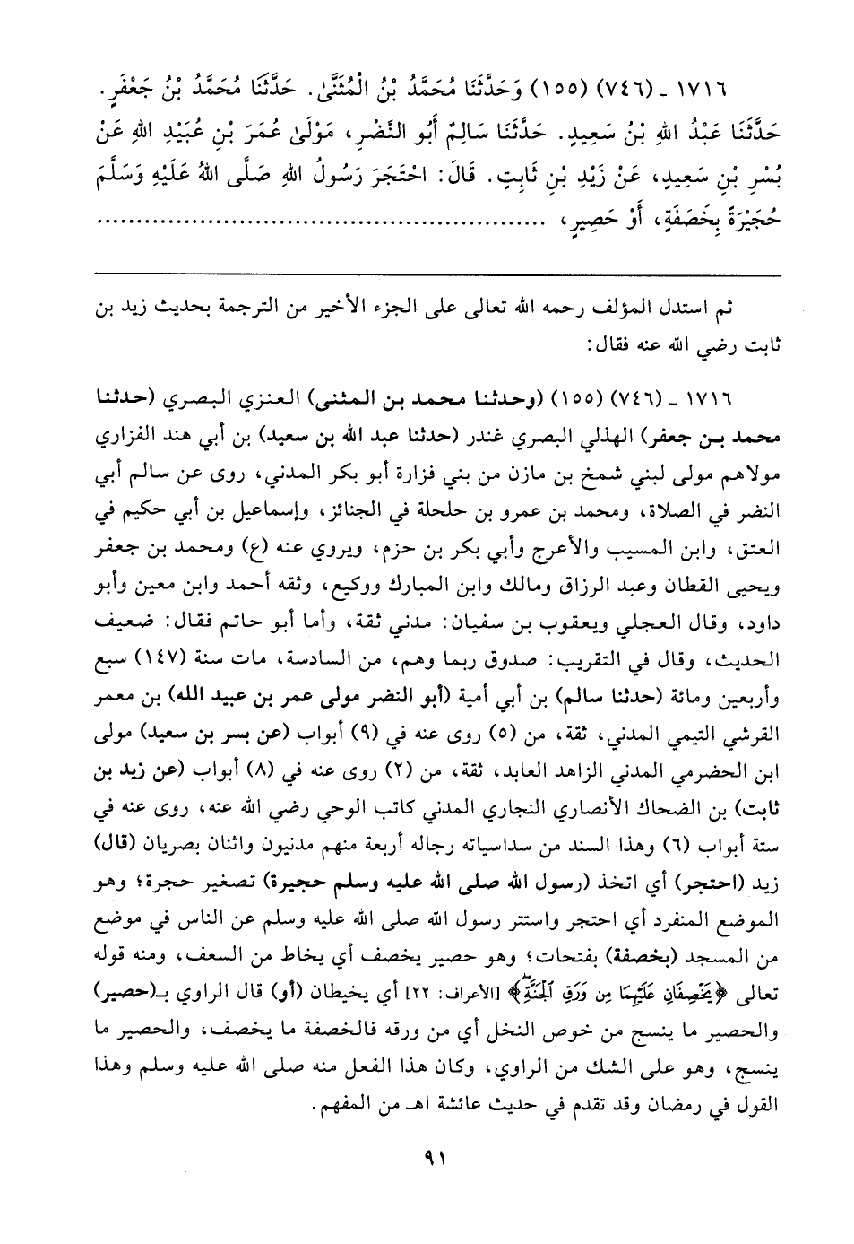 ١٧١٦ - (٧٤٦) (١٥٥) وَحدَّثَنَا مُحَمَّدُ بْنُ الْمُثَنَّى. حَدَّثَنَا مُحَمَّدُ بْنُ جَعْفَرٍ. حَدَّثَنَا عَبْدُ اللهِ بْنُ سَعِيدٍ. حَدَّثَنَا سَالِمٌ أبُو النَّضرِ، مَوْلَى عُمَرَ بْنِ عُبَيدِ اللهِ عَنْ بُسْرِ بْنِ سَعِيدٍ، عَنْ زَيدِ بْنِ ثَابِتٍ. قَال: احْتَجَرَ رَسُولُ اللهِ صَلَّى اللهُ عَلَيهِ وَسَلَّمَ حُجَيرَةً بِخَصَفَةٍ، أَوْ حَصِيرٍ،