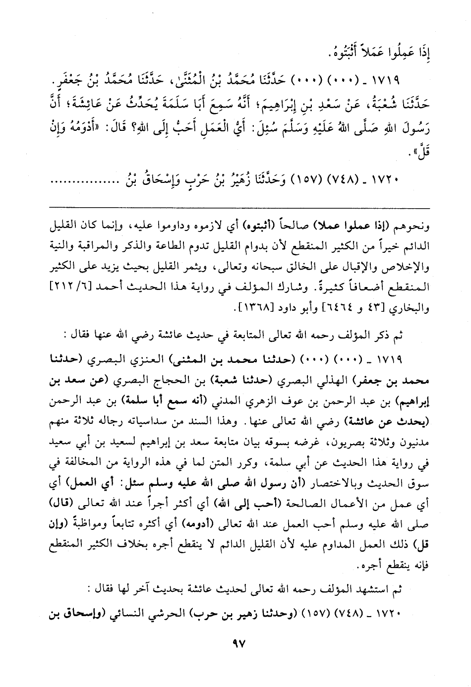 ١٧١٩ - (٠٠) (٠٠) (حَدَّثَنَا محمد بن المثنى) العنزي البصري (حَدَّثَنَا محمد بن جعفر) الهذلي البصري (حَدَّثَنَا شعبة) بن الحجاج البصري (عن سعد بن إبراهيم) بن عبد الرحمن بن عوف الزهري المدني (أنَّه سمع أبا سلمة) بن عبد الرحمن (يحدث عن عائشة) رضي الله تعالى عنها. وهذا السند من سداسياته رجاله ثلاثة منهم مدنيون وثلاثة بصريون، غرضه بسوقه بيان متابعة سعد بن إبراهيم لسعيد بن أبي سعيد في رواية هذا الحديث عن أبي سلمة، وكرر المتن لما في هذه الرواية من المخالفة في سوق الحديث وبالاختصار (أن رسول الله صلى الله عليه وسلم سئل: أي العمل) أي أي عمل من الأعمال الصالحة (أحب إلى الله) أي أكثر أجرًا عند الله تعالى (قال) صلى الله عليه وسلم أحب العمل عند الله تعالى (أدومه) أي أكثره تتابعًا ومواظبةً (وإن قل) ذلك العمل المداوم عليه لأن القليل الدائم لا ينقطع أجره بخلاف الكثير المنقطع فإنه ينقطع أجره.