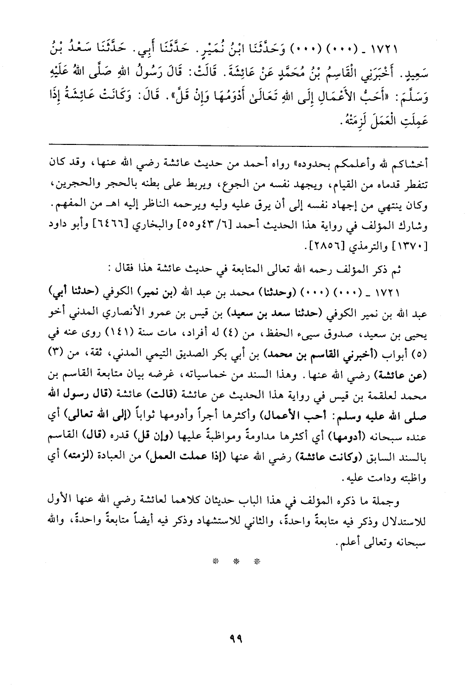 ١٧٢١ - (٠٠) (٠٠) (وحدثنا) محمد بن عبد الله (بن نمير) الكوفي (حَدَّثَنَا أبي) عبد الله بن نمير الكوفي (حَدَّثَنَا سعد بن سعيد) بن قيس بن عمرو الأنصاري المدني أخو يحيى بن سعيد، صدوق سيئ الحفظ، من (٤) له أفراد، مات سنة (١٤١) روى عنه في (٥) أبواب (أخبرني القاسم بن محمد) بن أبي بكر الصديق التيمي المدني، ثقة، من (٣) (عن عائشة) رضي الله عنها. وهذا السند من خماسياته، غرضه بيان متابعة القاسم بن محمد لعلقمة بن قيس في رواية هذا الحديث عن عائشة (قالت) عائشة (قال رسول الله صلى الله عليه وسلم: أحب الأعمال) وأكثرها أجرأ وأدومها ثوابًا (إلى الله تعالى) أي عنده سبحانه (أدومها) أي أكثرها مداومةً ومواظبةً عليها (وإن قل) قدره (قال) القاسم بالسند السابق (وكانت عائشة) رضي الله عنها (إذا عملت العمل) من العبادة (لزمته) أي واظبته ودامت عليه.