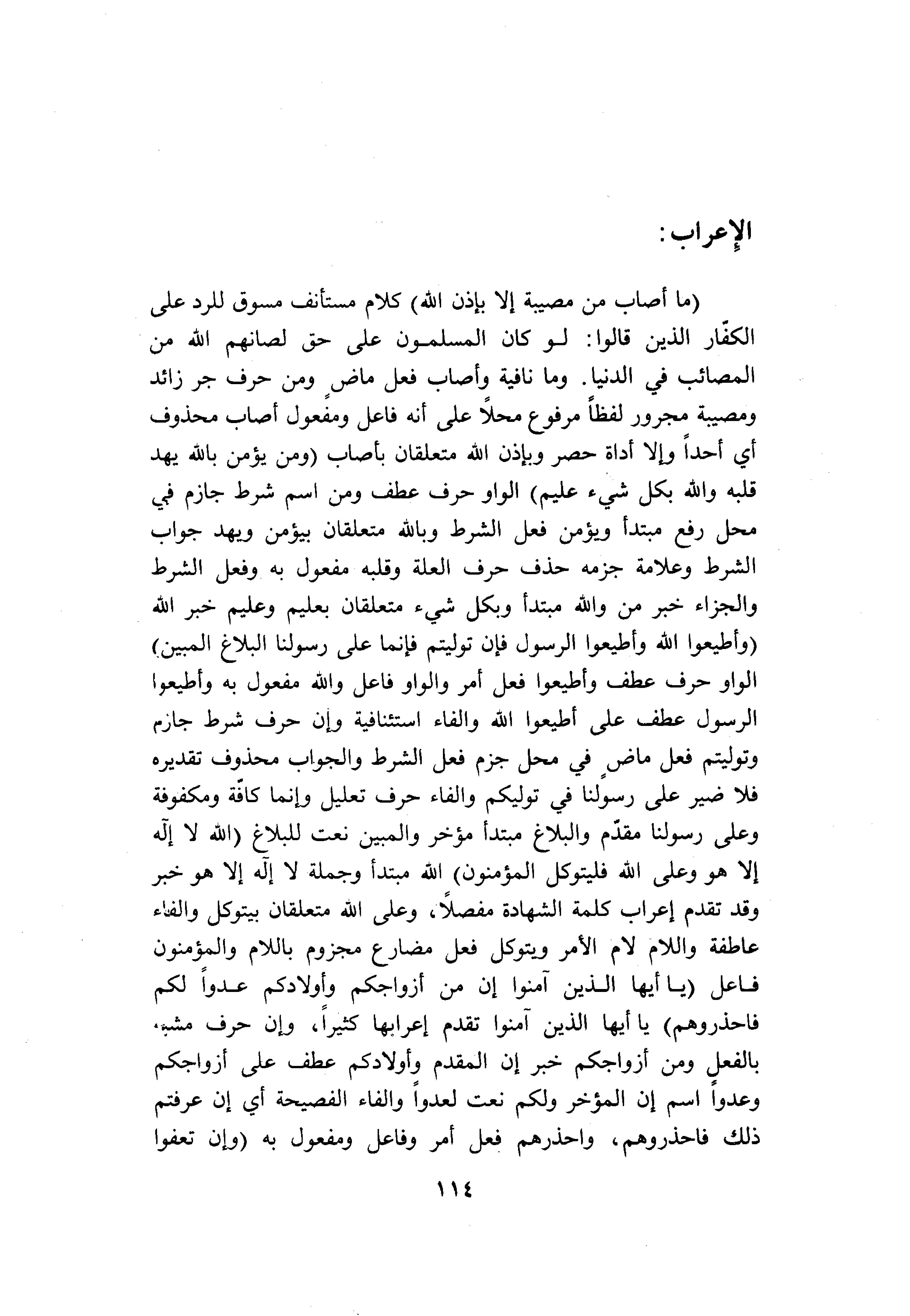 (ما أَصابَ مِنْ مُصِيبَةٍ إِلَّا بِإِذْنِ اللَّهِ) كلام مستأنف مسوق للرد على الكفّار الذين قالوا: لو كان المسلمون على حق لصانهم الله من المصائب في الدنيا. وما نافية وأصاب فعل ماض ومن حرف جر زائد ومصيبة مجرور لفظا مرفوع محلا على أنه فاعل ومفعول أصاب محذوف أي أحدا وإلا أداة حصر وبإذن الله متعلقان بأصاب (وَمَنْ يُؤْمِنْ بِاللَّهِ يَهْدِ قَلْبَهُ وَاللَّهُ بِكُلِّ شَيْءٍ عَلِيمٌ) الواو حرف عطف ومن اسم شرط جازم في محل رفع مبتدأ ويؤمن فعل الشرط وبالله متعلقان بيؤمن ويهد جواب الشرط وعلامة جزمه حذف حرف العلة وقلبه مفعول به وفعل الشرط والجزاء خبر من والله مبتدأ وبكل شيء متعلقان بعليم وعليم خبر الله (وَأَطِيعُوا اللَّهَ وَأَطِيعُوا الرَّسُولَ فَإِنْ تَوَلَّيْتُمْ فَإِنَّما عَلى رَسُولِنَا الْبَلاغُ الْمُبِينُ) الواو حرف عطف وأطيعوا فعل أمر والواو فاعل والله مفعول به وأطيعوا الرسول عطف على أطيعوا الله والفاء استئنافية وإن حرف شرط جازم وتوليتم فعل ماض في محل جزم فعل الشرط والجواب محذوف تقديره فلا ضير على رسولنا في توليكم والفاء حرف تعليل وإنما كافّة ومكفوفة وعلى رسولنا مقدّم والبلاغ مبتدأ مؤخر والمبين نعت للبلاغ (اللَّهُ لا إِلهَ إِلَّا هُوَ وَعَلَى اللَّهِ فَلْيَتَوَكَّلِ الْمُؤْمِنُونَ) الله مبتدأ وجملة لا إله إلا هو خبر وقد تقدم إعراب كلمة الشهادة مفصلا، وعلى الله متعلقان بيتوكل والفاء عاطفة واللام لام الأمر ويتوكل فعل مضارع مجزوم باللام والمؤمنون فاعل (يا أَيُّهَا الَّذِينَ آمَنُوا إِنَّ مِنْ أَزْواجِكُمْ وَأَوْلادِكُمْ عَدُوًّا لَكُمْ فَاحْذَرُوهُمْ) يا أيها الذين آمنوا تقدم إعرابها كثيرا، وإن حرف مشبه بالفعل ومن أزواجكم خبر إن المقدم وأولادكم عطف على أزواجكم وعدوا اسم إن المؤخر ولكم نعت لعدوا والفاء الفصيحة أي إن عرفتم ذلك فاحذروهم، واحذرهم فعل أمر وفاعل ومفعول به (وَإِنْ تَعْفُوا