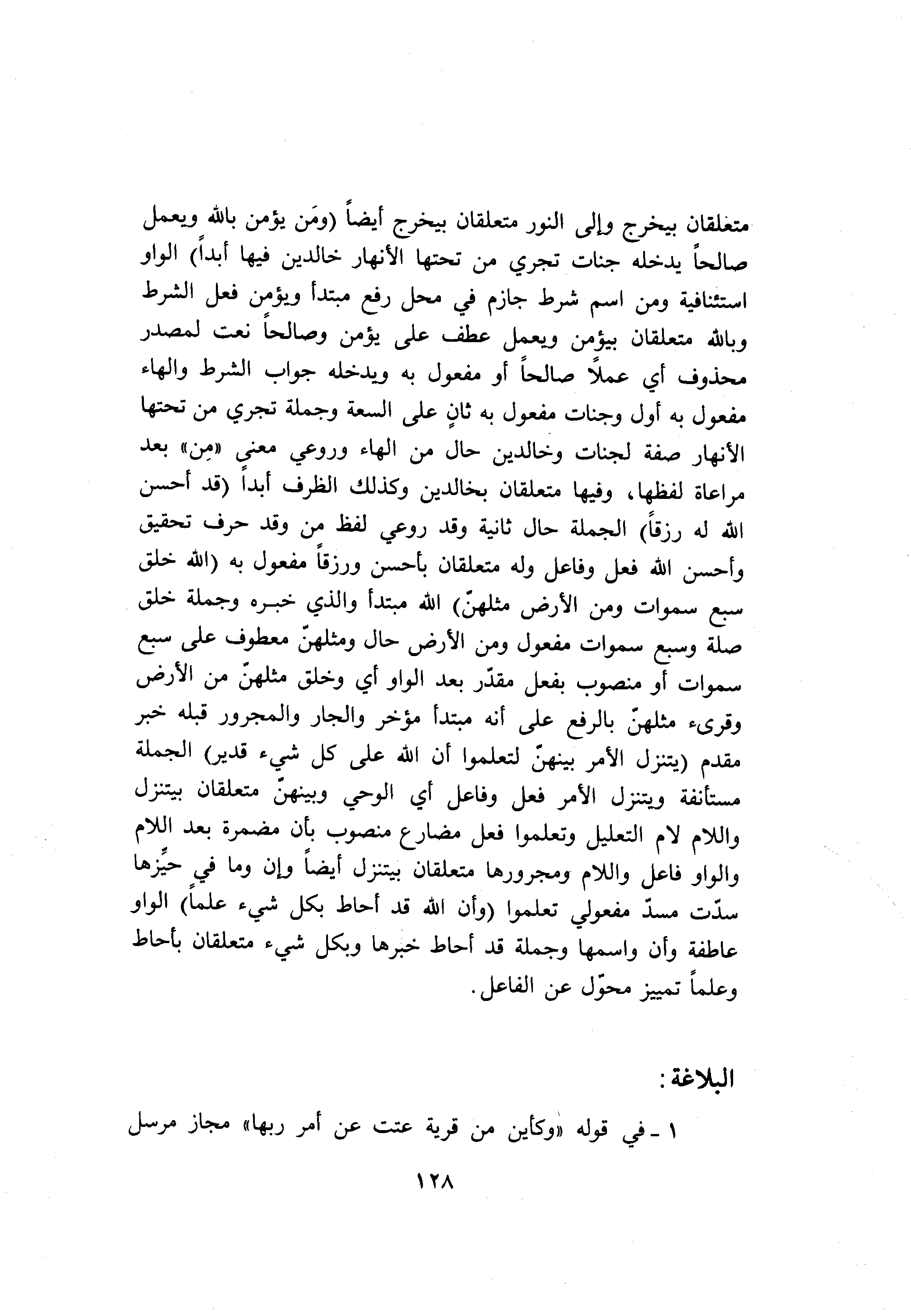 متعلقان بيخرج وإلى النور متعلقان بيخرج أيضا (وَمَنْ يُؤْمِنْ بِاللَّهِ وَيَعْمَلْ صالِحاً يُدْخِلْهُ جَنَّاتٍ تَجْرِي مِنْ تَحْتِهَا الْأَنْهارُ خالِدِينَ فِيها أَبَداً) الواو استئنافية ومن اسم شرط جازم في محل رفع مبتدأ ويؤمن فعل الشرط وبالله متعلقان بيؤمن ويعمل عطف على يؤمن وصالحا نعت لمصدر محذوف أي عملا صالحا أو مفعول به ويدخله جواب الشرط والهاء مفعول به أول وجنات مفعول به ثان على السعة وجملة تجري من تحتها الأنهار صفة لجنات وخالدين حال من الهاء وروعي معنى «من» بعد مراعاة لفظها، وفيها متعلقان بخالدين وكذلك الظرف أبدا (قَدْ أَحْسَنَ اللَّهُ لَهُ رِزْقاً) الجملة حال ثانية وقد روعي لفظ من وقد حرف تحقيق وأحسن الله فعل وفاعل وله متعلقان بأحسن ورزقا مفعول به (اللَّهُ الَّذِي خَلَقَ سَبْعَ سَماواتٍ وَمِنَ الْأَرْضِ مِثْلَهُنَّ) الله مبتدأ والذي خبره وجملة خلق صلة وسبع سموات مفعول ومن الأرض حال ومثلهنّ معطوف على سبع سموات أو منصوب بفعل مقدّر بعد الواو أي وخلق مثلهنّ من الأرض وقرىء مثلهنّ بالرفع على أنه مبتدأ مؤخر والجار والمجرور قبله خبر مقدم (يَتَنَزَّلُ الْأَمْرُ بَيْنَهُنَّ لِتَعْلَمُوا أَنَّ اللَّهَ عَلى كُلِّ شَيْءٍ قَدِيرٌ) الجملة مستأنفة ويتنزل الأمر فعل وفاعل أي الوحي وبينهنّ متعلقان بيتنزل واللام لام التعليل وتعلموا فعل مضارع منصوب بأن مضمرة بعد اللام والواو فاعل واللام ومجرورها متعلقان بيتنزل أيضا وإن وما في حيّزها سدّت مسدّ مفعولي تعلموا (وَأَنَّ اللَّهَ قَدْ أَحاطَ بِكُلِّ شَيْءٍ عِلْماً) الواو عاطفة وأن واسمها وجملة قد أحاط خبرها وبكل شيء متعلقان بأحاط وعلما تمييز محوّل عن الفاعل.