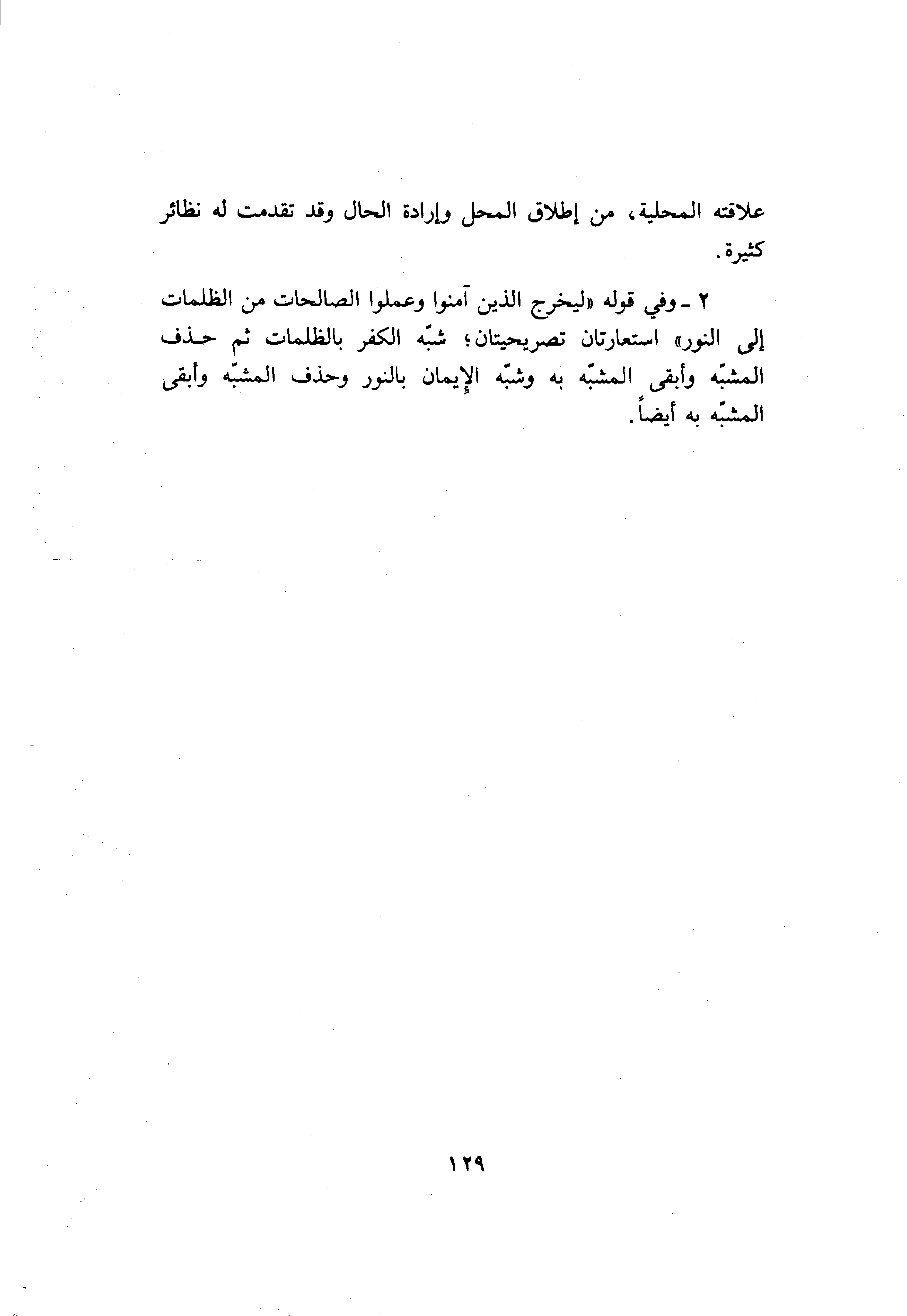 2- وفي قوله «ليخرج الذين آمنوا وعملوا الصالحات من الظلمات إلى النور» استعارتان تصريحيتان شبّه الكفر بالظلمات ثم حذف المشبّه وأبقى المشبّه به وشبّه الإيمان بالنور وحذف المشبّه وأبقى المشبّه به أيضا.