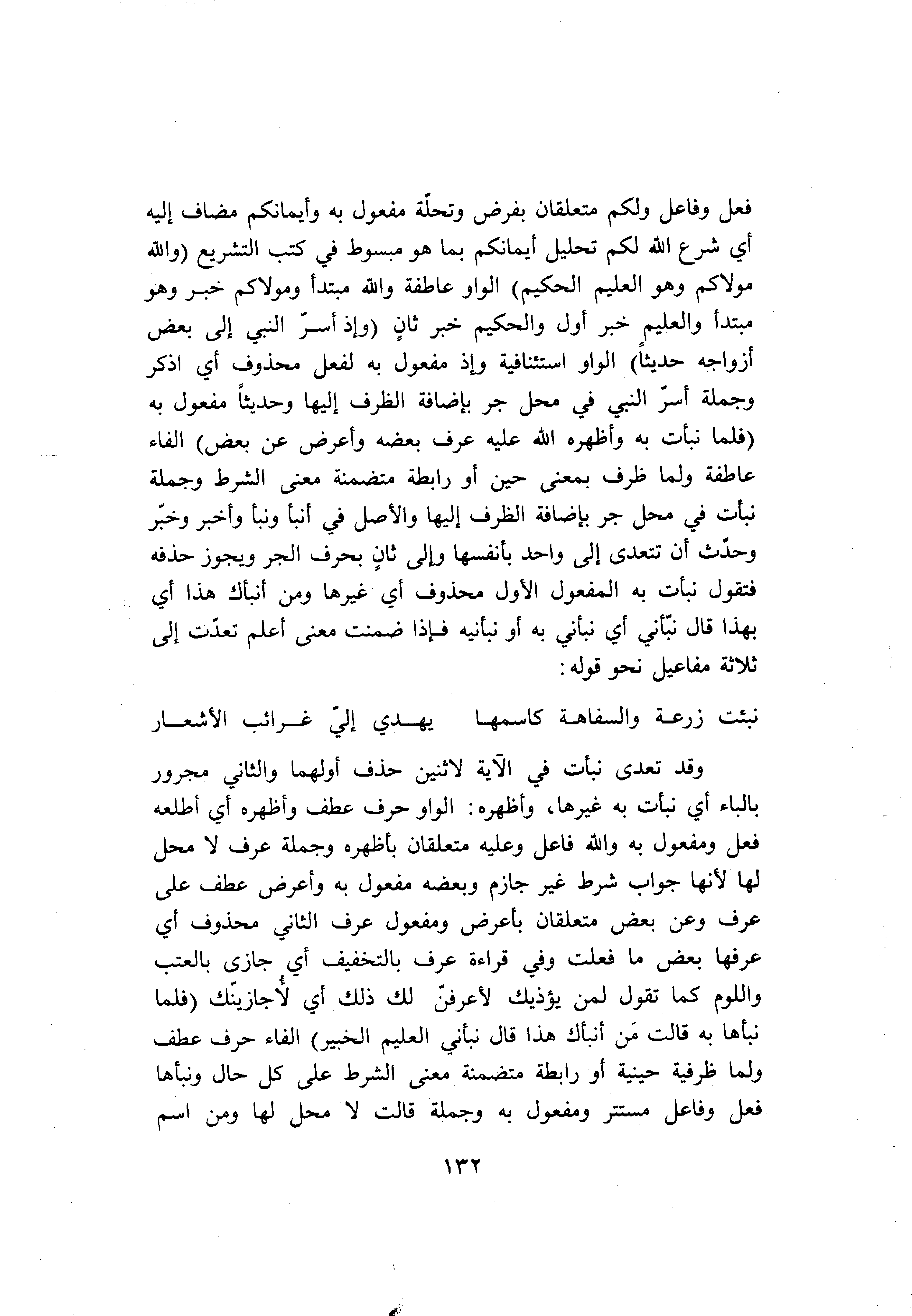 وقد تعدى نبأت في الآية لاثنين حذف أولهما والثاني مجرور بالباء أي نبأت به غيرها، وأظهره: الواو حرف عطف وأظهره أي أطلعه فعل ومفعول به والله فاعل وعليه متعلقان بأظهره وجملة عرف لا محل لها لأنها جواب شرط غير جازم وبعضه مفعول به وأعرض عطف على عرف وعن بعض متعلقان بأعرض ومفعول عرف الثاني محذوف أي عرفها بعض ما فعلت وفي قراءة عرف بالتخفيف أي جازى بالعتب واللوم كما تقول لمن يؤذيك لأعرفنّ لك ذلك أي لأجازينّك (فَلَمَّا نَبَّأَها بِهِ قالَتْ مَنْ أَنْبَأَكَ هذا قالَ نَبَّأَنِيَ الْعَلِيمُ الْخَبِيرُ) الفاء حرف عطف ولما ظرفية حينية أو رابطة متضمنة معنى الشرط على كل حال ونبأها فعل وفاعل مستتر ومفعول به وجملة قالت لا محل لها ومن اسم
