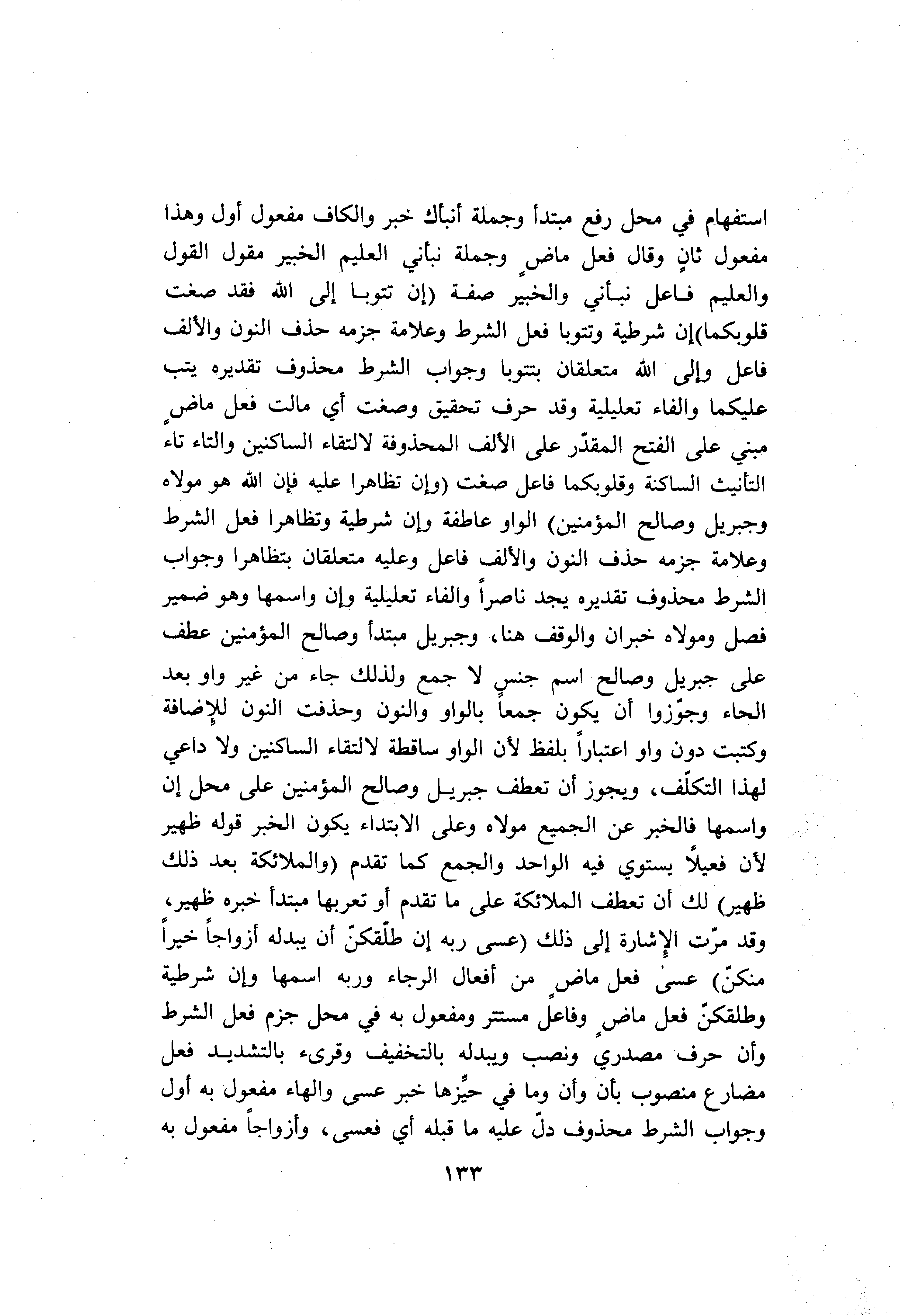 استفهام في محل رفع مبتدأ وجملة أنبأك خبر والكاف مفعول أول وهذا مفعول ثان وقال فعل ماض وجملة نبأني العليم الخبير مقول القول والعليم فاعل نبأني والخبير صفة (إِنْ تَتُوبا إِلَى اللَّهِ فَقَدْ صَغَتْ قُلُوبُكُما) إن شرطية وتتوبا فعل الشرط وعلامة جزمه حذف النون والألف فاعل وإلى الله متعلقان بتتوبا وجواب الشرط محذوف تقديره يتب عليكما والفاء تعليلية وقد حرف تحقيق وصغت أي مالت فعل ماض مبني على الفتح المقدّر على الألف المحذوفة لالتقاء الساكنين والتاء تاء التأنيث الساكنة وقلوبكما فاعل صغت (وَإِنْ تَظاهَرا عَلَيْهِ فَإِنَّ اللَّهَ هُوَ مَوْلاهُ وَجِبْرِيلُ وَصالِحُ الْمُؤْمِنِينَ) الواو عاطفة وإن شرطية وتظاهرا فعل الشرط وعلامة جزمه حذف النون والألف فاعل وعليه متعلقان بتظاهرا وجواب الشرط محذوف تقديره يجد ناصرا والفاء تعليلية وإن واسمها وهو ضمير فصل ومولاه خبران والوقف هنا، وجبريل مبتدأ وصالح المؤمنين عطف على جبريل وصالح اسم جنس لا جمع ولذلك جاء من غير واو بعد الحاء وجوّزوا أن يكون جمعا بالواو والنون وحذفت النون للإضافة وكتبت دون واو اعتبارا بلفظ لأن الواو ساقطة لالتقاء الساكنين ولا داعي لهذا التكلّف، ويجوز أن تعطف جبريل وصالح المؤمنين على محل إن واسمها فالخبر عن الجميع مولاه وعلى الابتداء يكون الخبر قوله ظهير لأن فعيلا يستوي فيه الواحد والجمع كما تقدم (وَالْمَلائِكَةُ بَعْدَ ذلِكَ ظَهِيرٌ) لك أن تعطف الملائكة على ما تقدم أو تعربها مبتدأ خبره ظهير، وقد مرّت الإشارة إلى ذلك (عَسى رَبُّهُ إِنْ طَلَّقَكُنَّ أَنْ يُبْدِلَهُ أَزْواجاً خَيْراً مِنْكُنَّ) عسى فعل ماض من أفعال الرجاء وربه اسمها وإن شرطية وطلقكنّ فعل ماض وفاعل مستتر ومفعول به في محل جزم فعل الشرط وأن حرف مصدري ونصب ويبدله بالتخفيف وقرىء بالتشديد فعل مضارع منصوب بأن وأن وما في حيّزها خبر عسى والهاء مفعول به أول وجواب الشرط محذوف دلّ عليه ما قبله أي فعسى، وأزواجا مفعول به