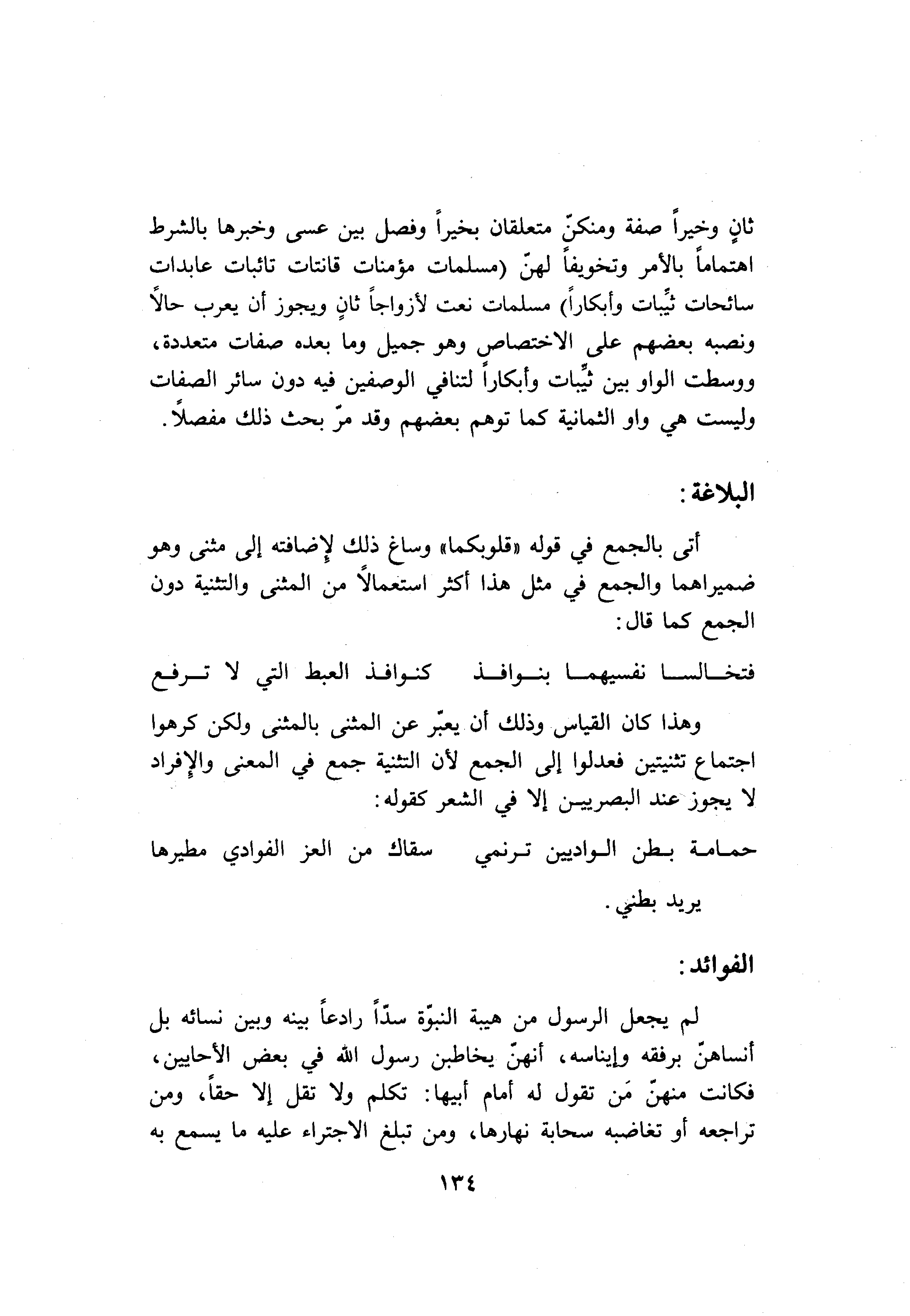 ثان وخيرا صفة ومنكنّ متعلقان بخيرا وفصل بين عسى وخبرها بالشرط اهتماما بالأمر وتخويفا لهنّ (مُسْلِماتٍ مُؤْمِناتٍ قانِتاتٍ تائِباتٍ عابِداتٍ سائِحاتٍ ثَيِّباتٍ وَأَبْكاراً) مسلمات نعت لأزواجا ثان ويجوز أن يعرب حالا ونصبه بعضهم على الاختصاص وهو جميل وما بعده صفات متعددة، ووسطت الواو بين ثيّبات وأبكارا لتنافي الوصفين فيه دون سائر الصفات وليست هي واو الثمانية كما توهم بعضهم وقد مرّ بحث ذلك مفصلا.