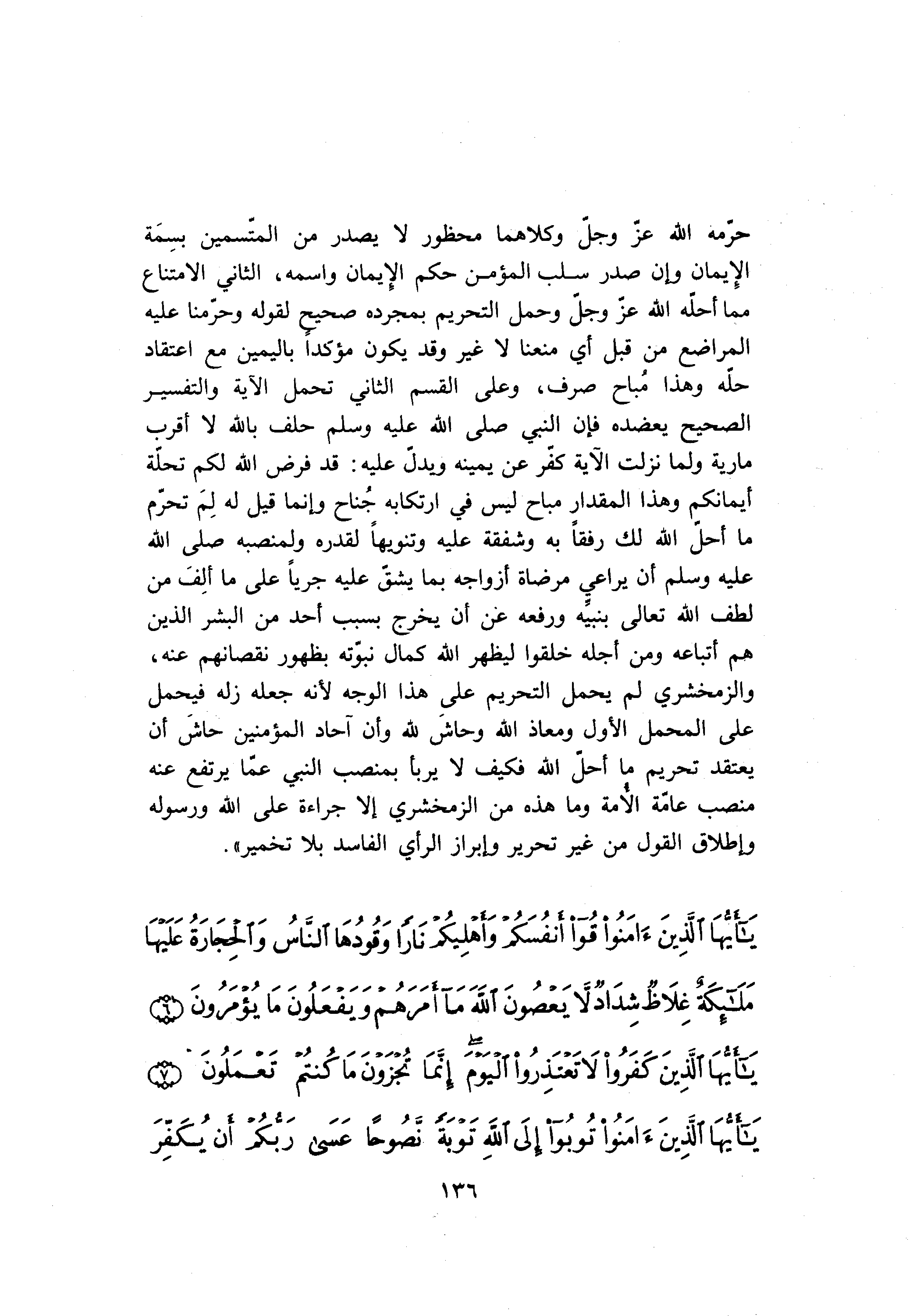 حرّمه الله عزّ وجلّ وكلاهما محظور لا يصدر من المتّسمين بسمة الإيمان وإن صدر سلب المؤمن حكم الإيمان واسمه، الثاني الامتناع مما أحلّه الله عزّ وجلّ وحمل التحريم بمجرده صحيح لقوله وحرّمنا عليه المراضع من قبل أي منعنا لا غير وقد يكون مؤكدا باليمين مع اعتقاد حلّه وهذا مباح صرف، وعلى القسم الثاني تحمل الآية والتفسير الصحيح يعضده فإن النبي صلّى الله عليه وسلم حلف بالله لا أقرب مارية ولما نزلت الآية كفّر عن يمينه ويدلّ عليه: قد فرض الله لكم تحلّة أيمانكم وهذا المقدار مباح ليس في ارتكابه جناح وإنما قيل له لم تحرّم ما أحلّ الله لك رفقا به وشفقة عليه وتنويها لقدره ولمنصبه صلّى الله عليه وسلم أن يراعي مرضاة أزواجه بما يشقّ عليه جريا على ما ألف من لطف الله تعالى بنبيّه ورفعه عن أن يخرج بسبب أحد من البشر الذين هم أتباعه ومن أجله خلقوا ليظهر الله كمال نبوّته بظهور نقصانهم عنه، والزمخشري لم يحمل التحريم على هذا الوجه لأنه جعله زله فيحمل على المحمل الأول ومعاذ الله وحاش لله وأن آحاد المؤمنين حاش أن يعتقد تحريم ما أحلّ الله فكيف لا يربأ بمنصب النبي عمّا يرتفع عنه منصب عامّة الأمة وما هذه من الزمخشري إلا جراءة على الله ورسوله وإطلاق القول من غير تحرير وإبراز الرأي الفاسد بلا تخمير» .